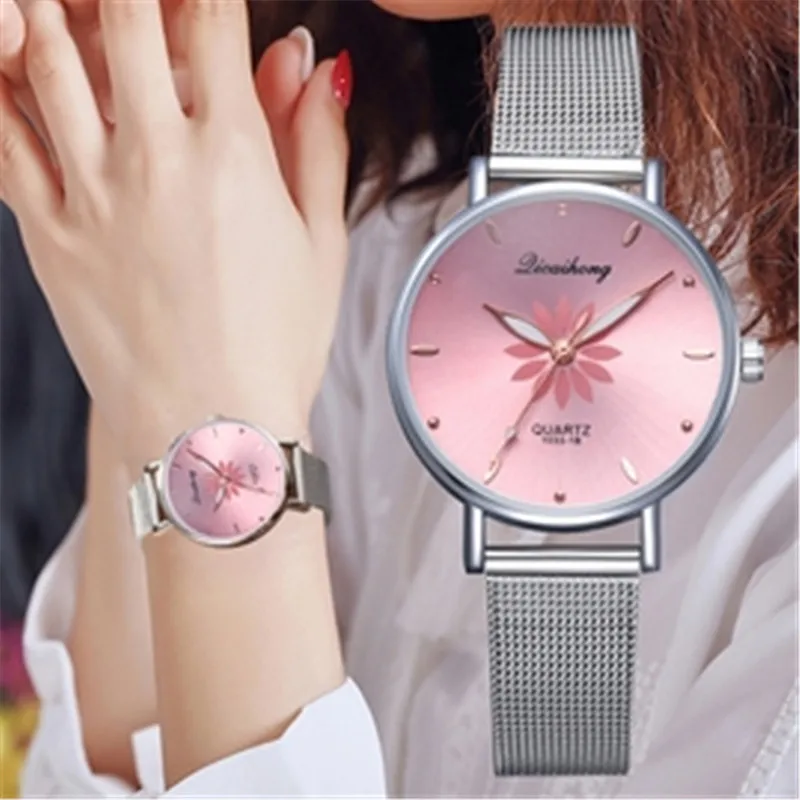 Женские наручные часы, Роскошный Серебряный популярный розовый циферблат, цветы, металлический женский браслет, кварцевые часы, модные наручные часы, 2019