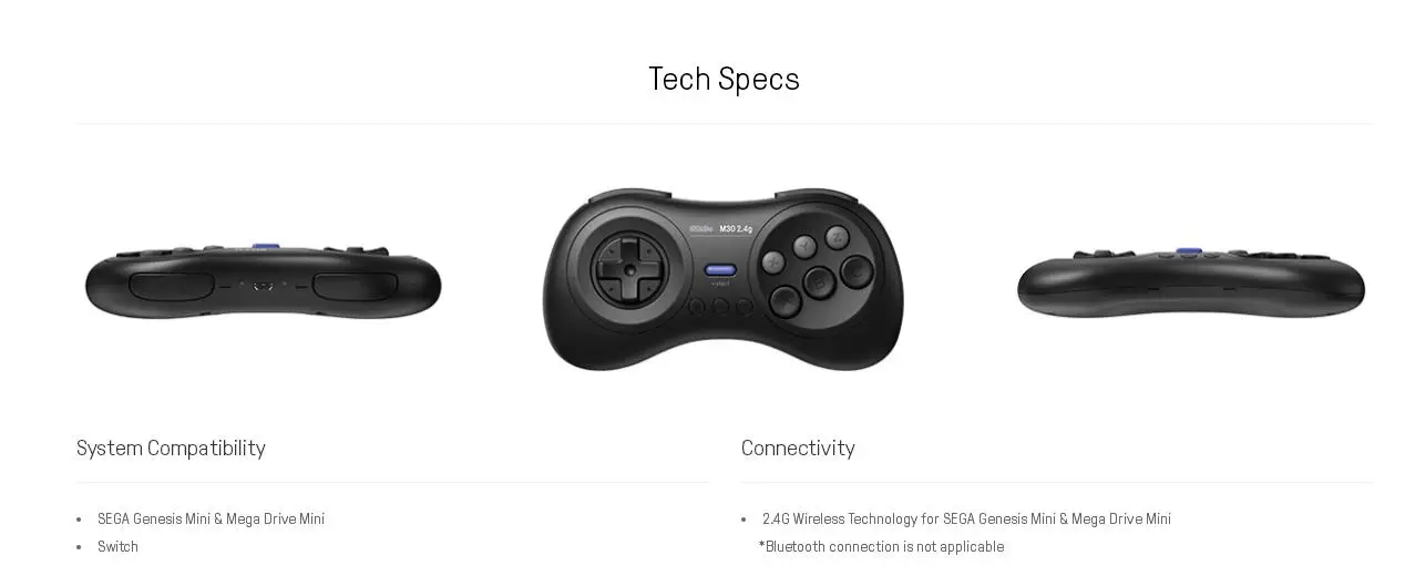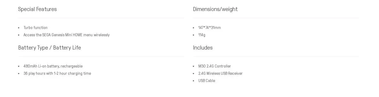 * Совместим с SEGA Genesis mini, Mega drive mini и Nintendo Switch* Беспроводная технология 2,4G для SEGA Genesis Mini и Mega Drive Mini* Доступ к домашнему меню SEGA Genesis Mini без проводов* 35 часов воспроизведения с временем зарядки 1-2 часа* Включает 8bitdo M30 2,4G контроллер, 2,4G приемник и USB-кабель