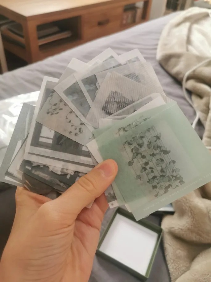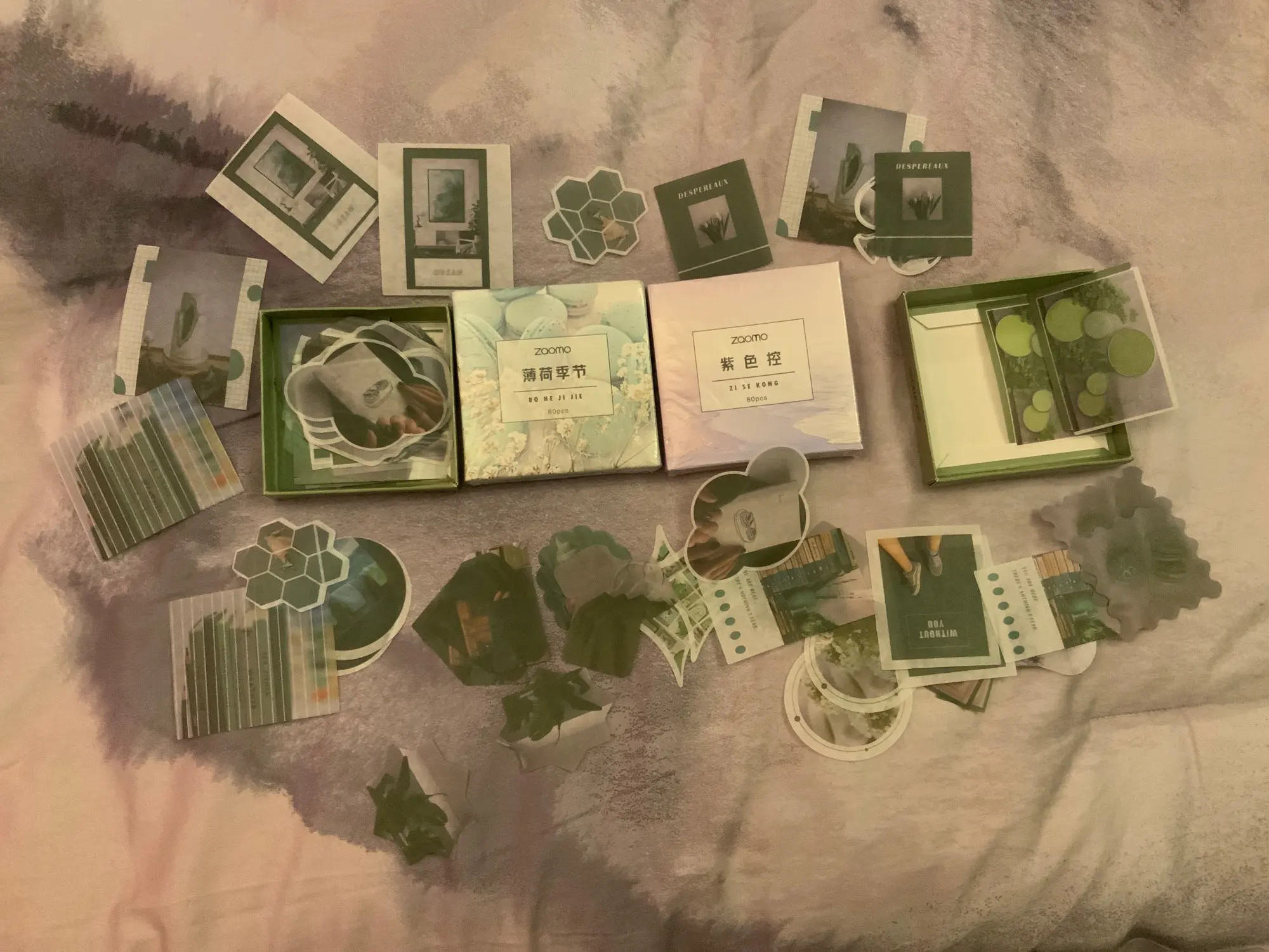 De cada sticker, hay 2. Aesthetic del color verde menta. Son tipo washi, y bastante lindas. Justo lo que esperaba. De mis favoritos.