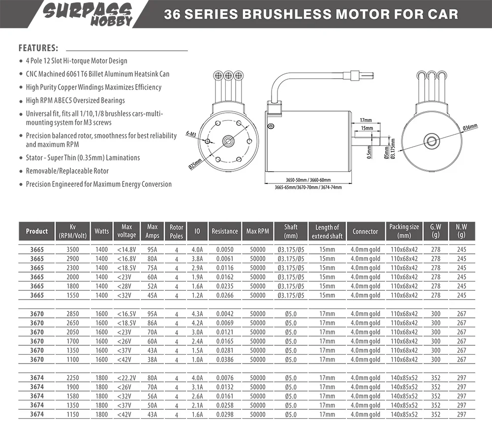 Бесщеточный двигатель SURPASS HOBBY 3670 1350KV 2050KV 2650KV 5mm в...