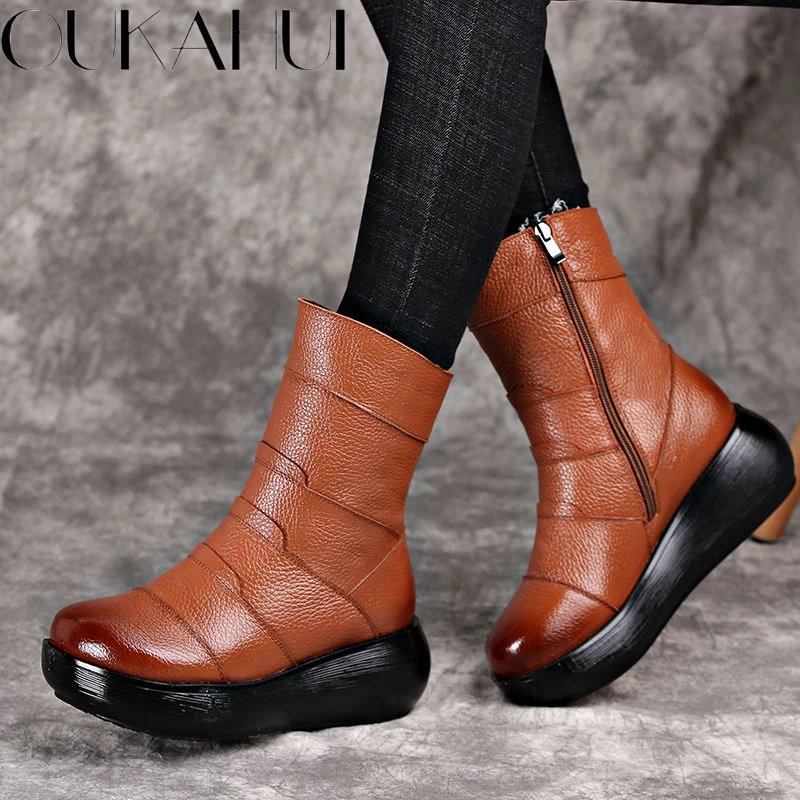 OUKAHUI Осенние Теплые винтажные ботильоны из натуральной кожи для ...