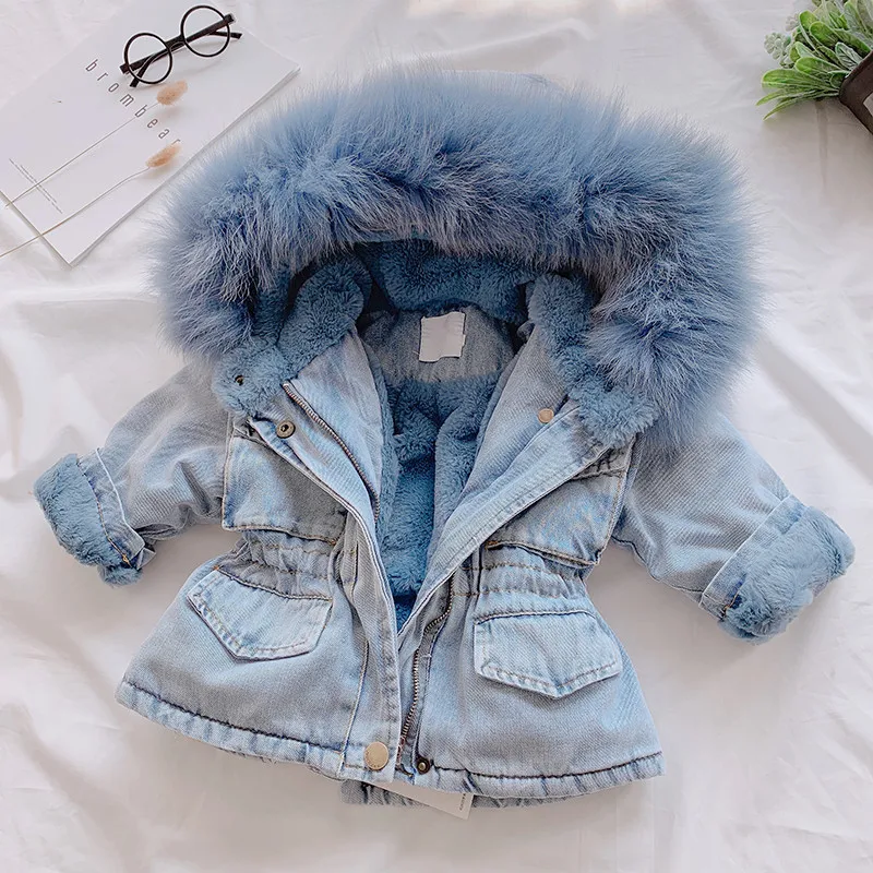 Зимняя джинсовая куртка для маленьких девочек с мехом, теплая верхн...