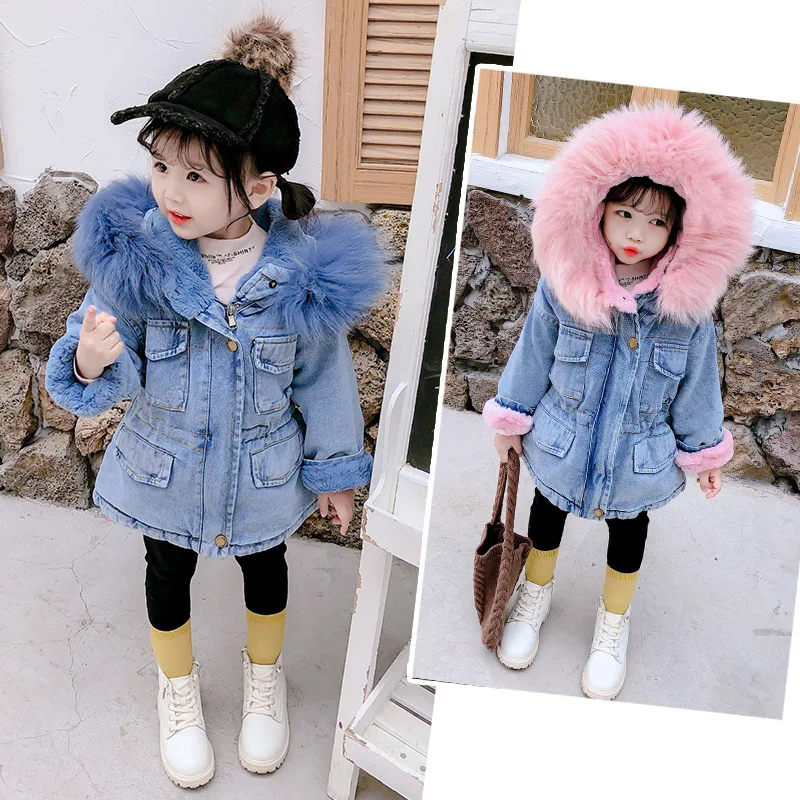 Зимние джинсовые куртки для маленьких девочек, Вельветовая утепленная ковбойская верхняя одежда для маленьких девочек, джинсовое пальто с большим меховым воротником