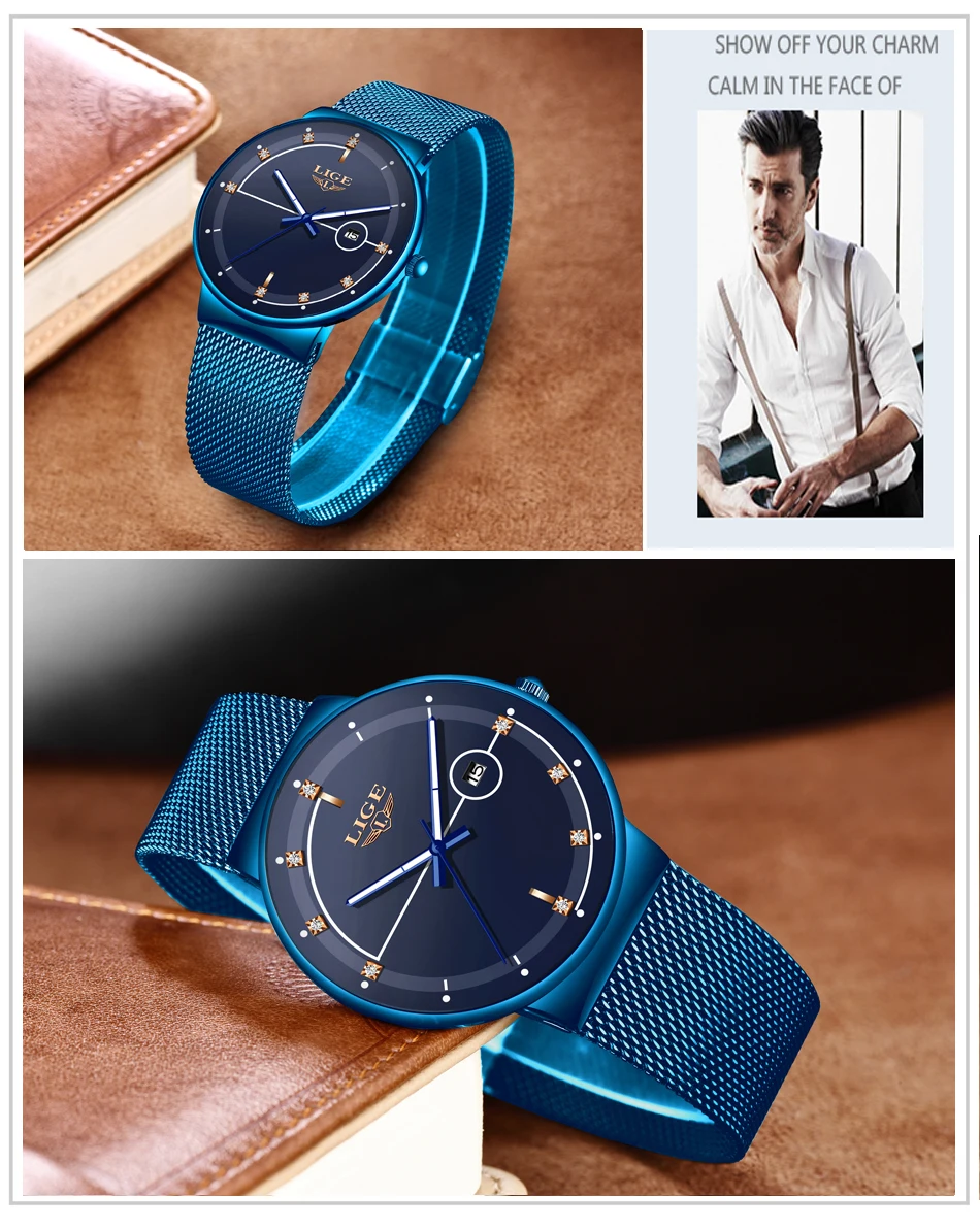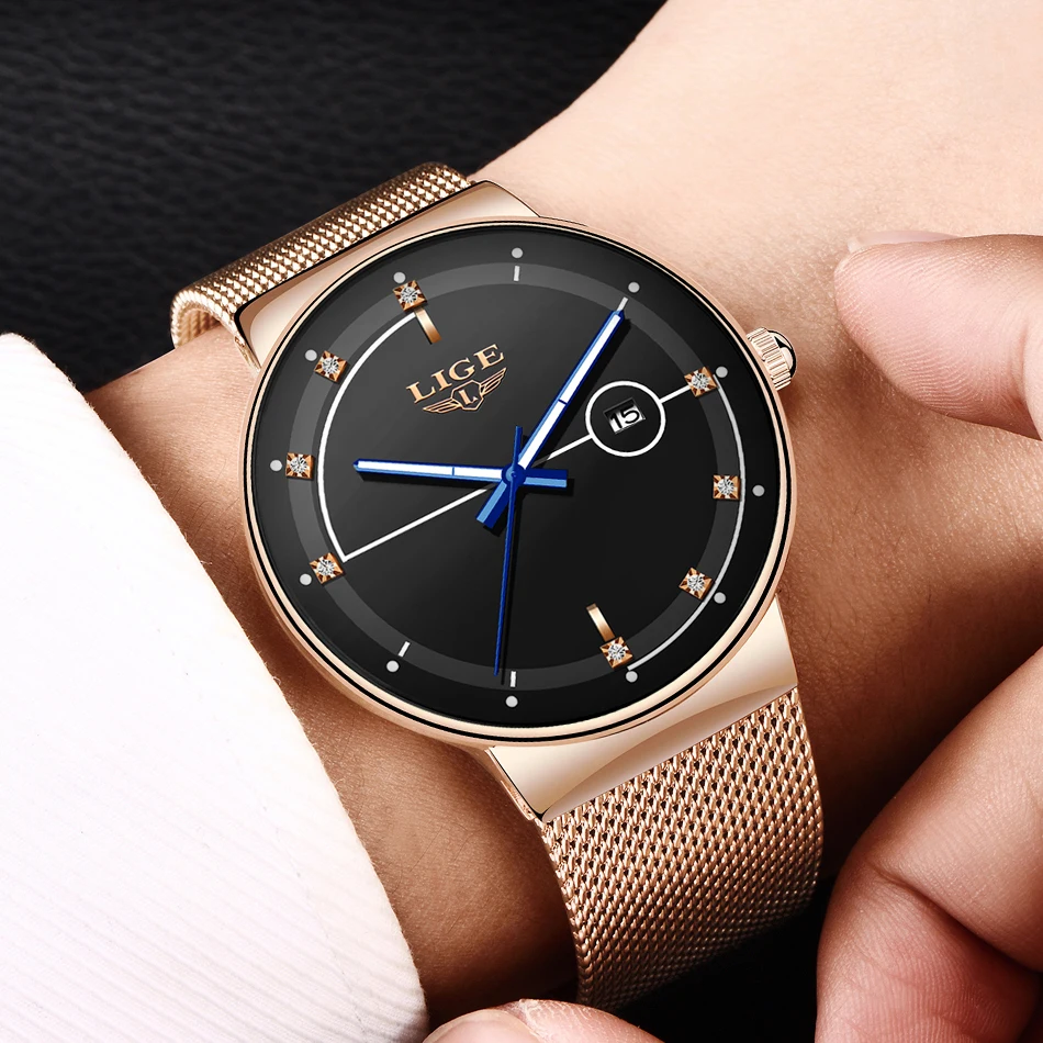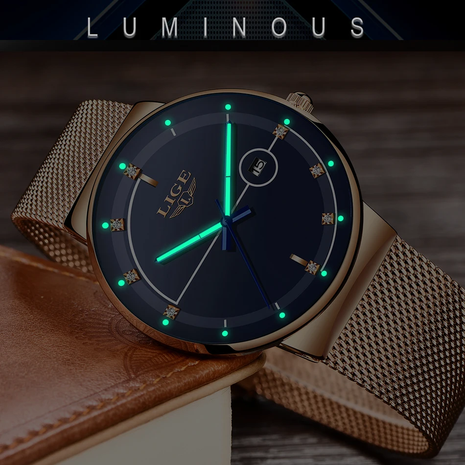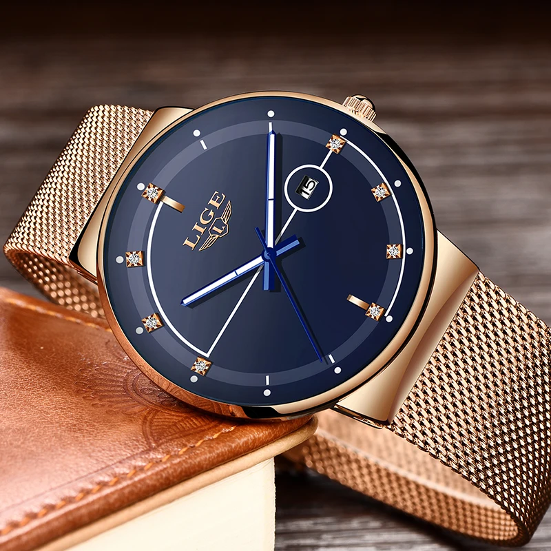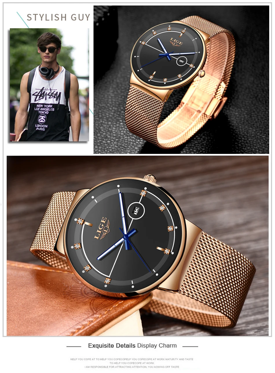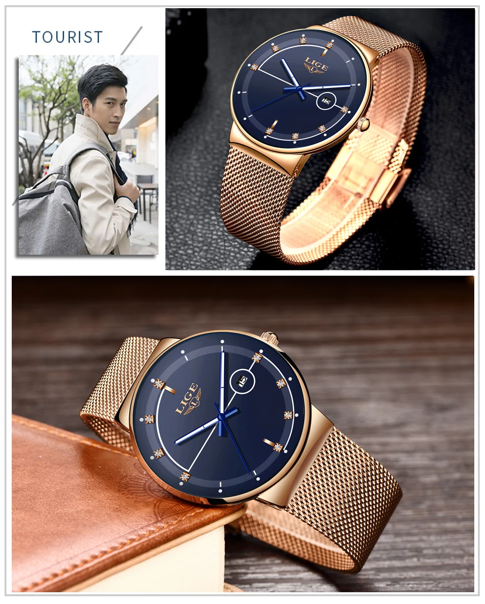 Часы наручные LIGE Мужские кварцевые ультратонкие, модные брендовые Роскошные водонепроницаемые золотистые с сетчатым ремешком
