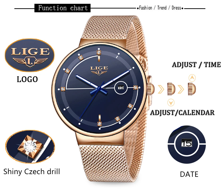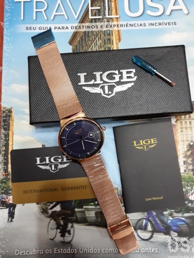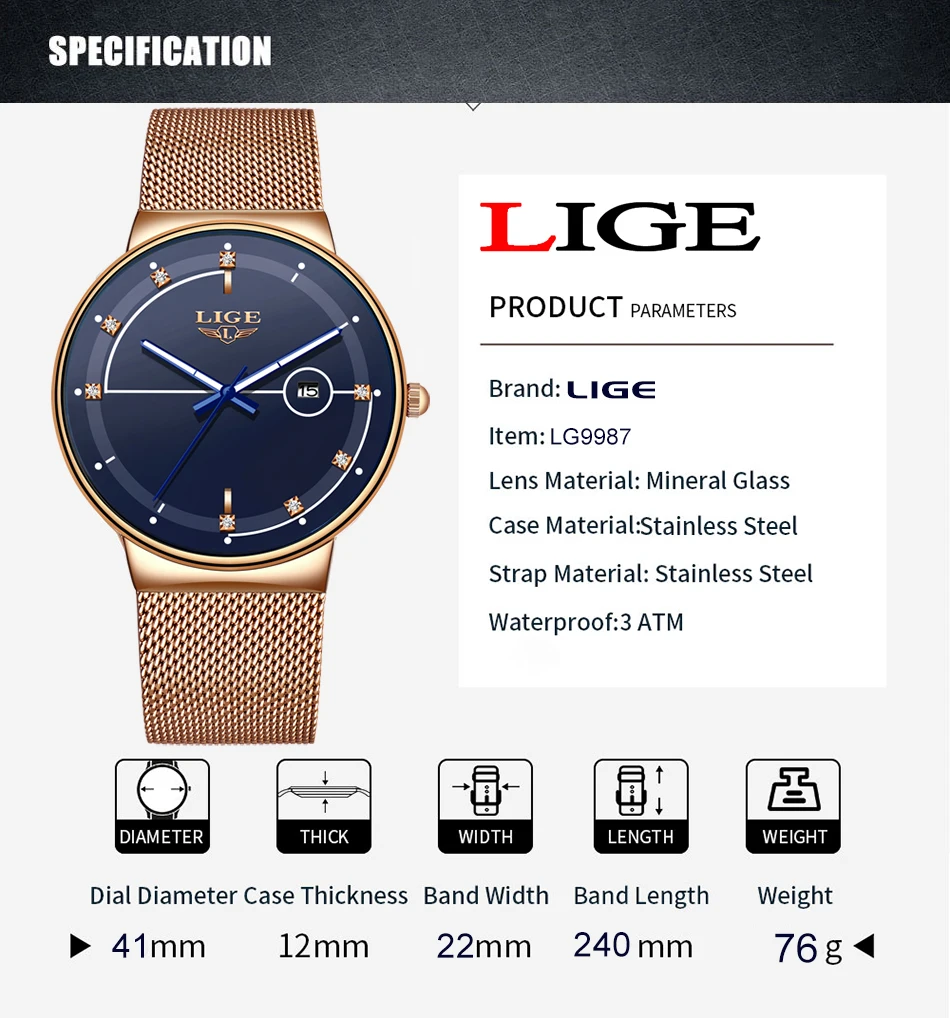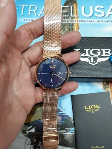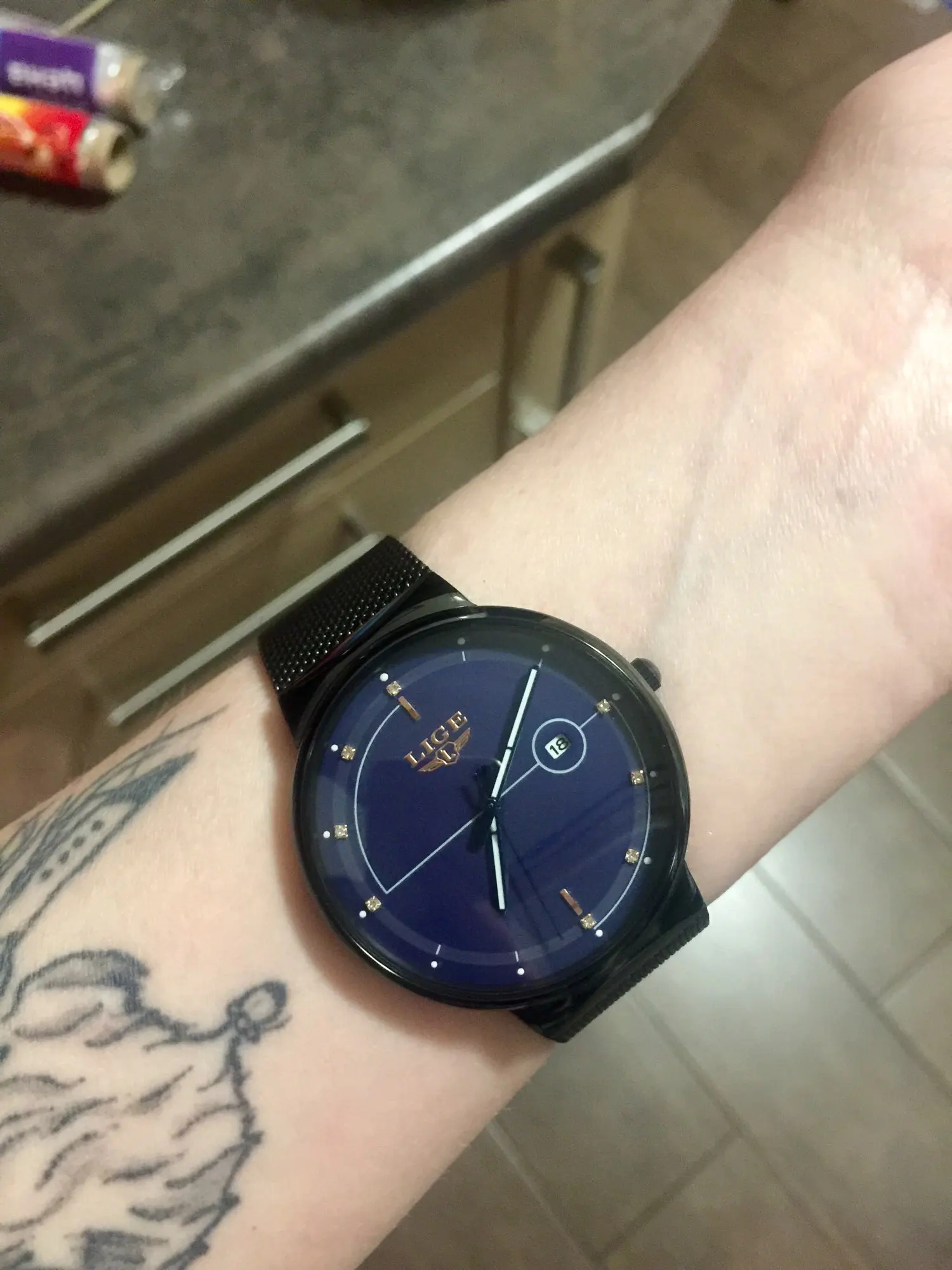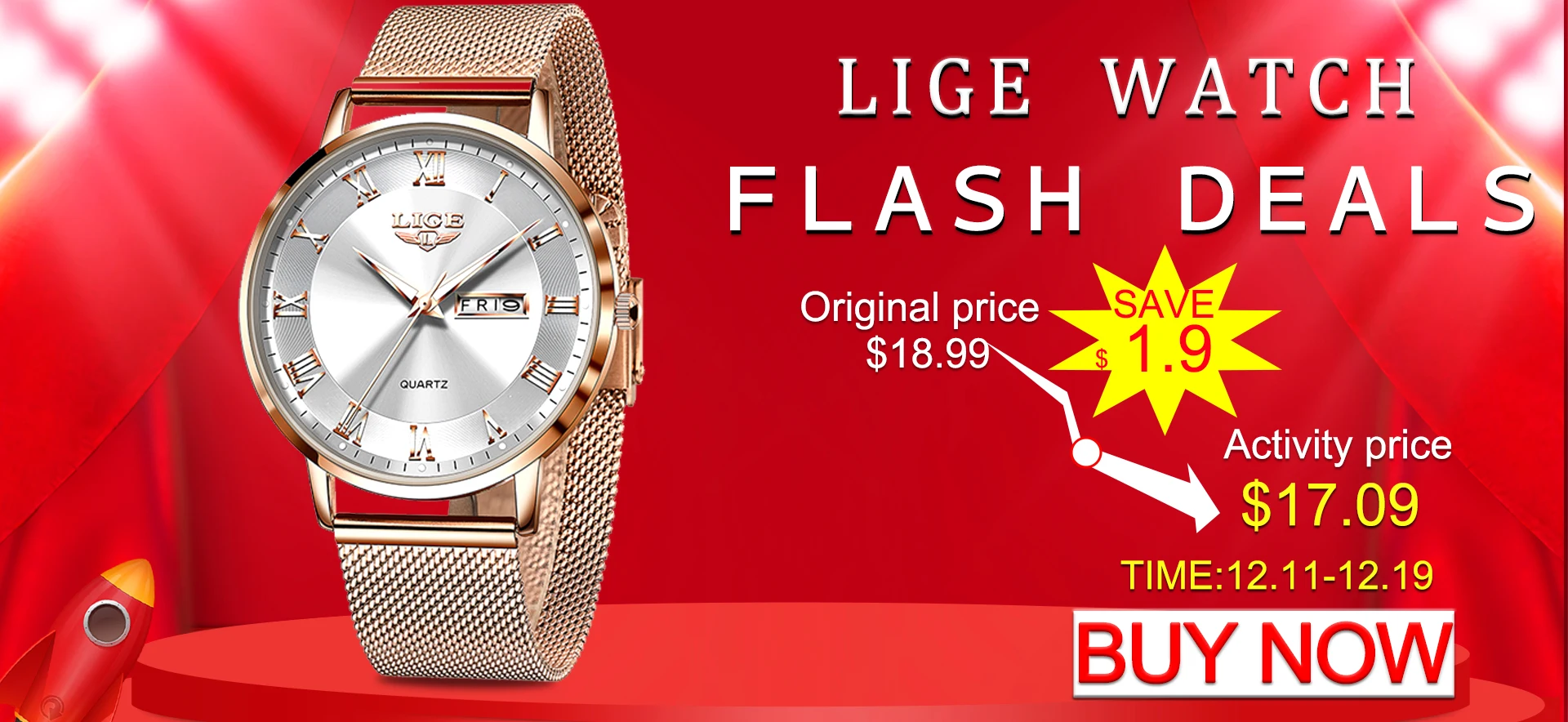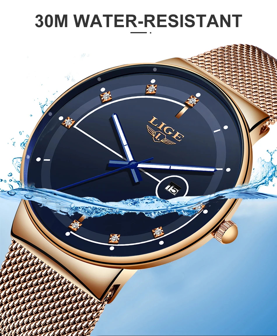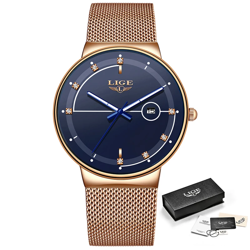 Часы наручные LIGE Мужские кварцевые ультратонкие, модные брендовые Роскошные водонепроницаемые золотистые с сетчатым ремешком