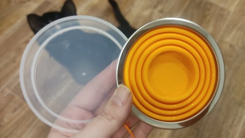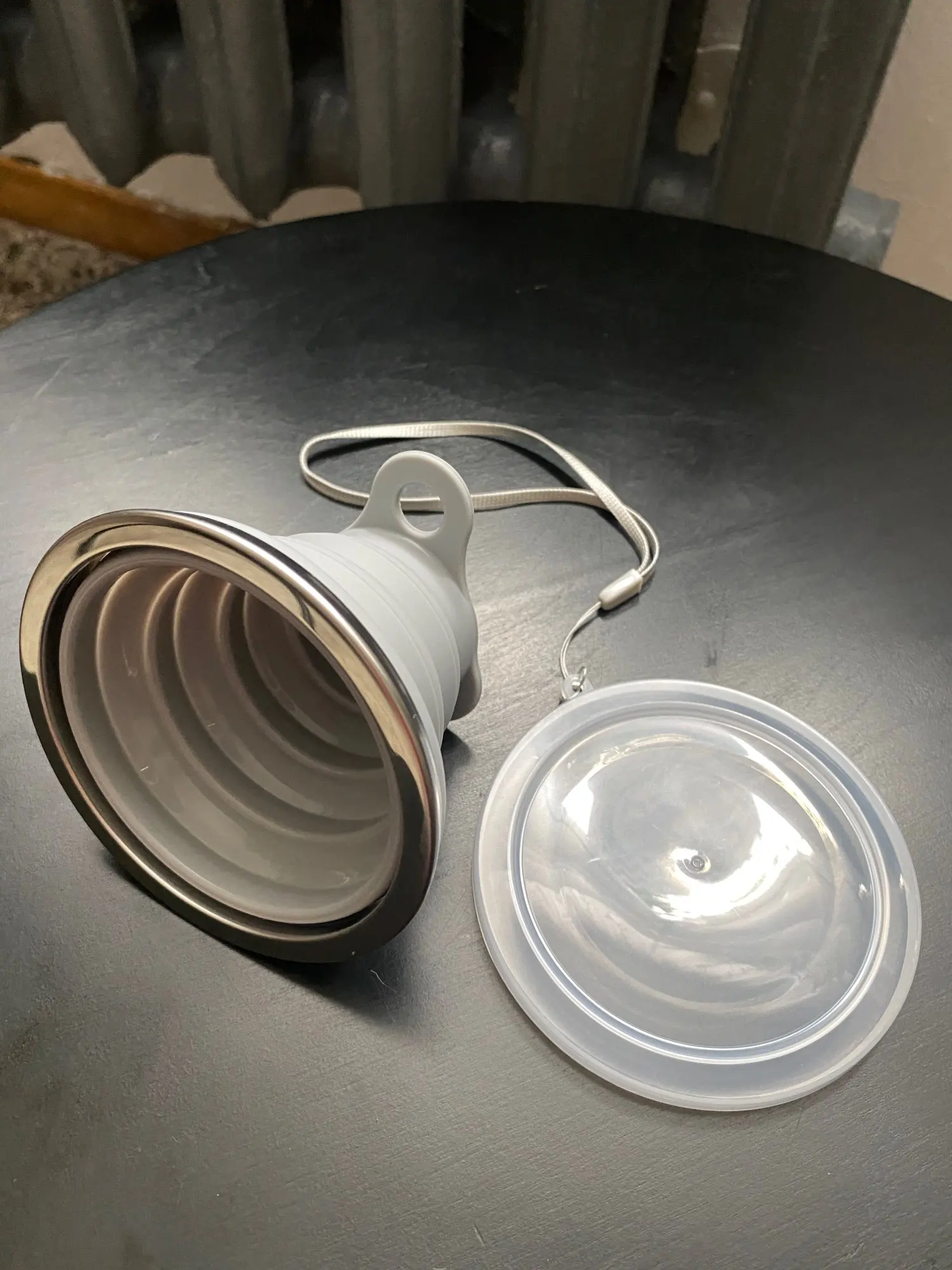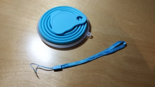 Прочная толстая резина. Удобно раскладывается (можно разложить на разную длинну). Хорошо стоит, не падает. Полное отсутствие запаха, даже запаха резины нет (к моему удивлению). В сложенном состоянии компактная. Крышка закрывается герметично и очень плотно, даже удерживает воду в таком состоянии внутри если переворачивать и трясти кружку (тоже был приятно удивлен этим свойством).