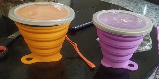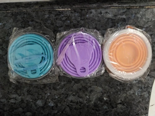 Быстрая доставка через Мист Экспресс. Чашки хорошие. Крышка закрывается герметично. Устойчивое дно. Запаха нет. Реально удобно носить с собой - в сложенном виде тонкая, диаметр чуть меньше 10 см. Внутри нанесены метки 200, 150, 100, 50 мл. Горячую воду заливал - всё ок.