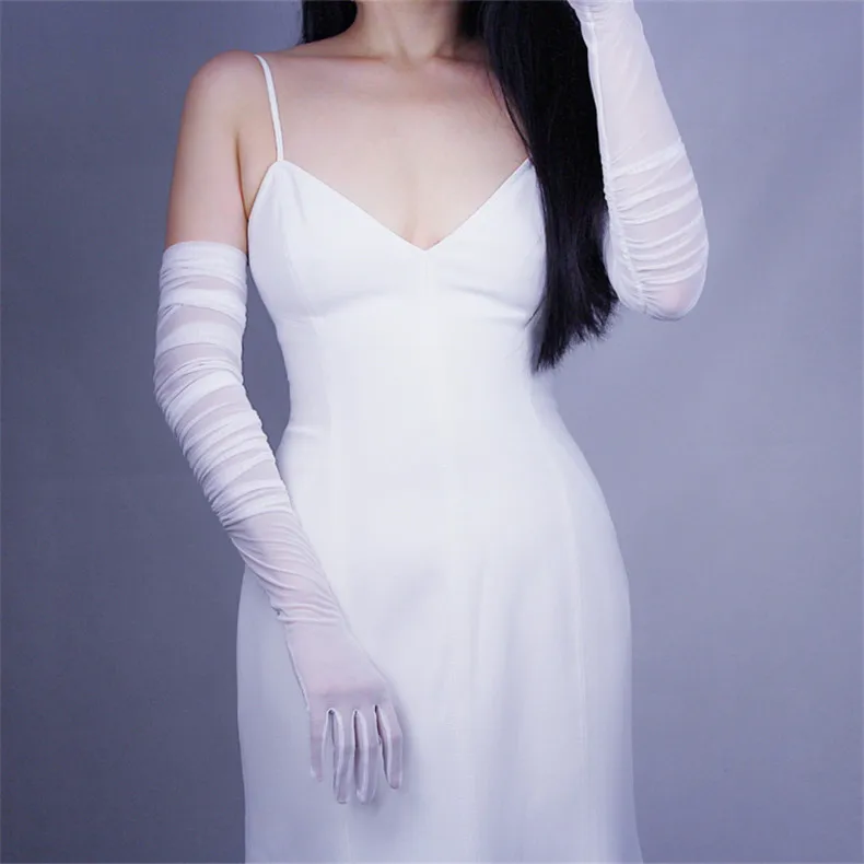 Черные шелковые плиссированные длинные перчатки, эластичная кружевная сетчатая пряжа, тонкая марля, длинные черные прозрачные женские перчатки WWS09