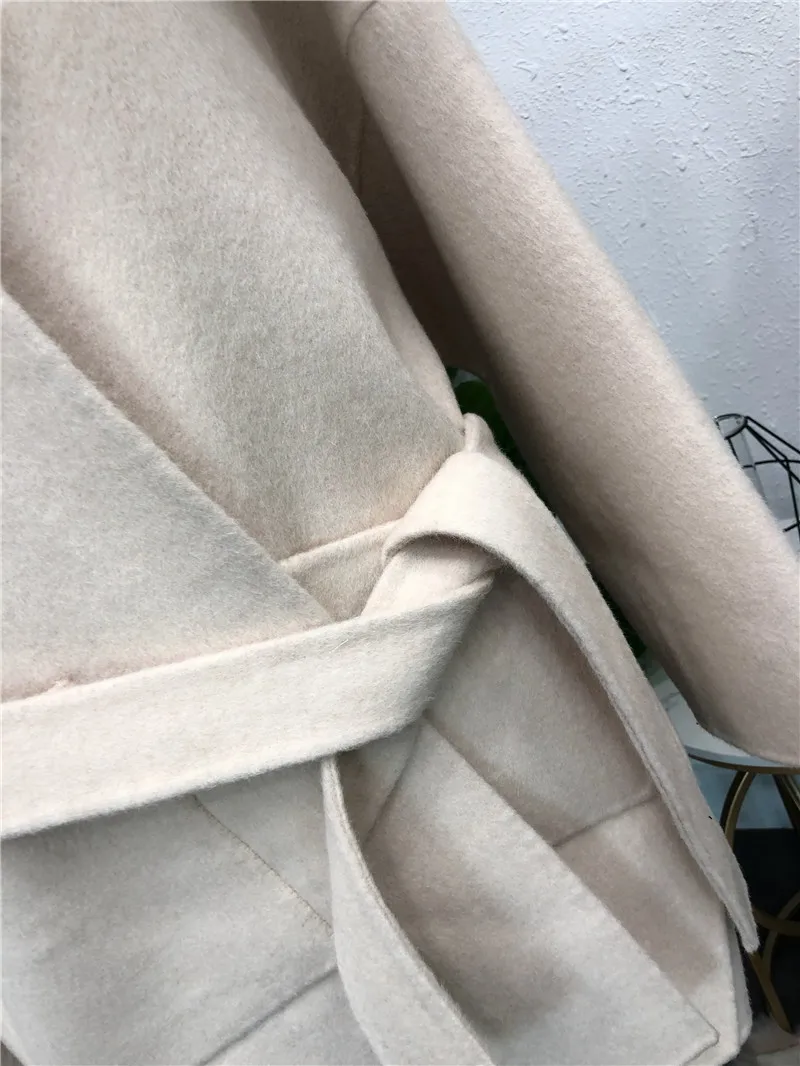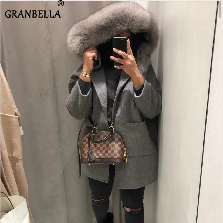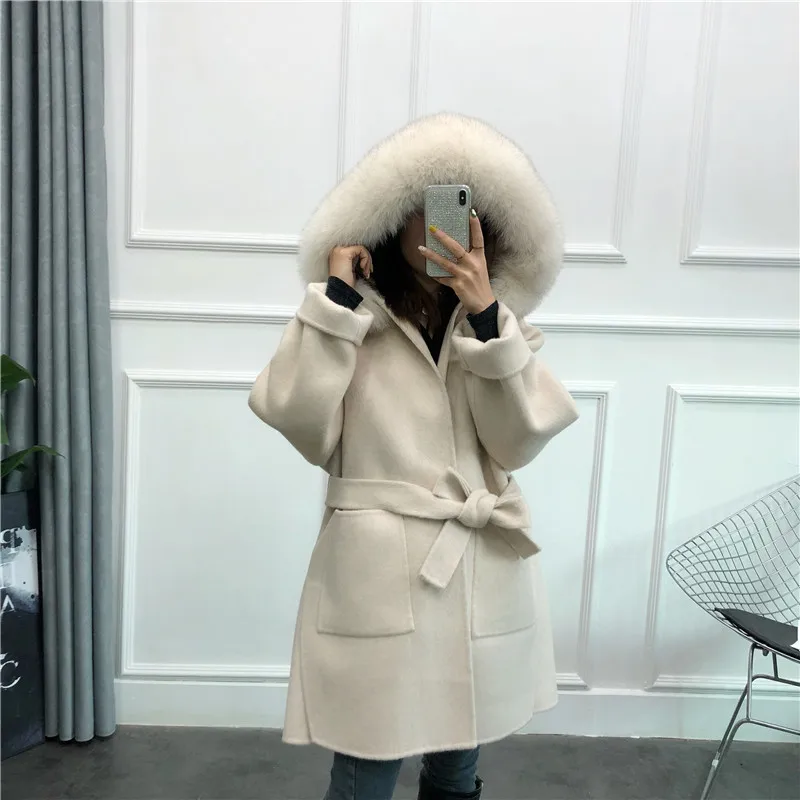 Женское шерстяное пальто с капюшоном, элегантное однотонное теплое пальто с поясом и отделкой из лисьего меха, зима 2020