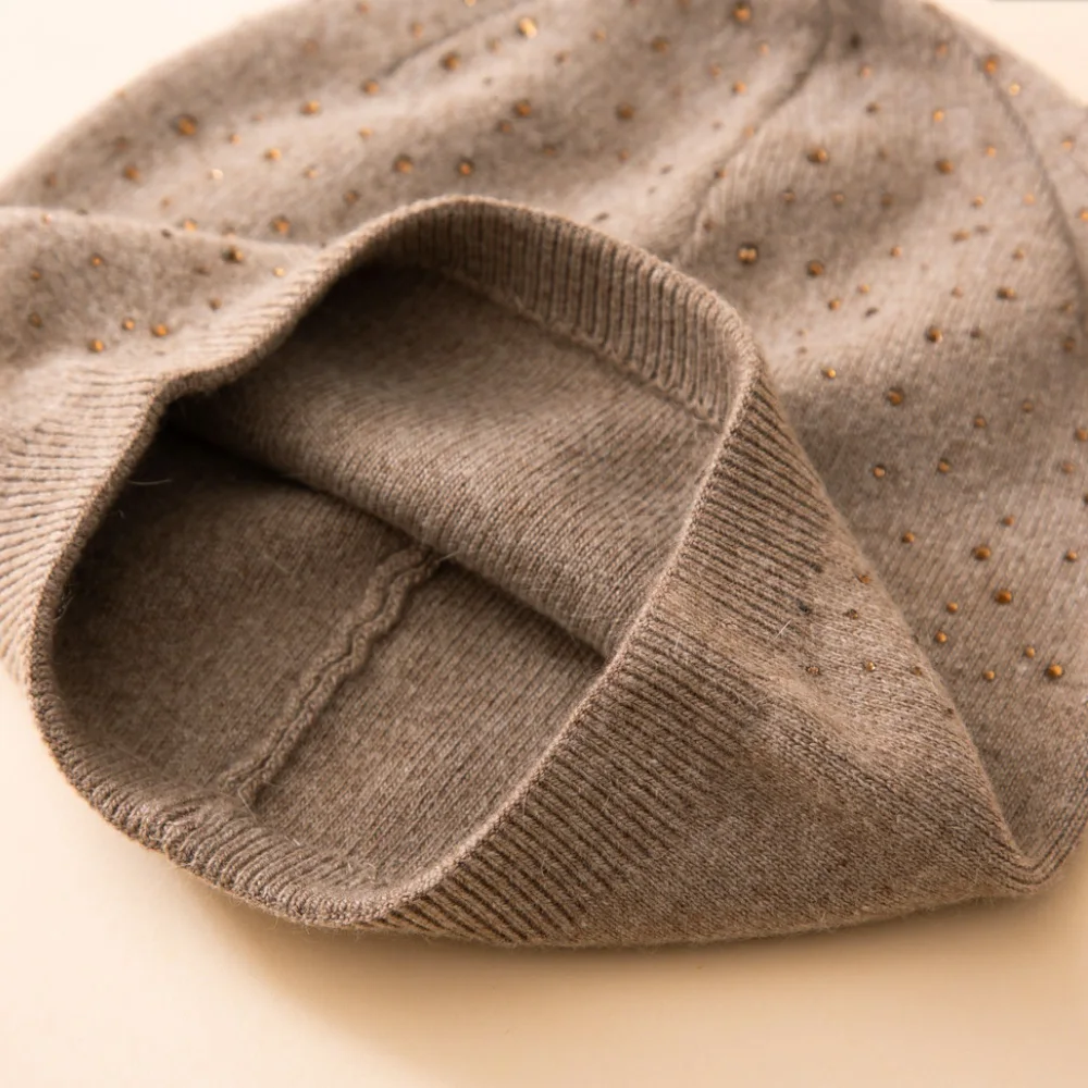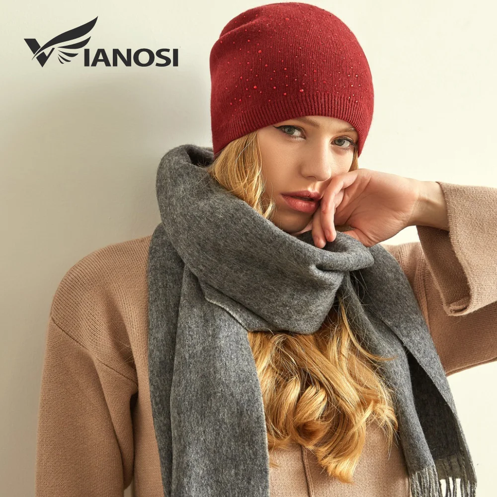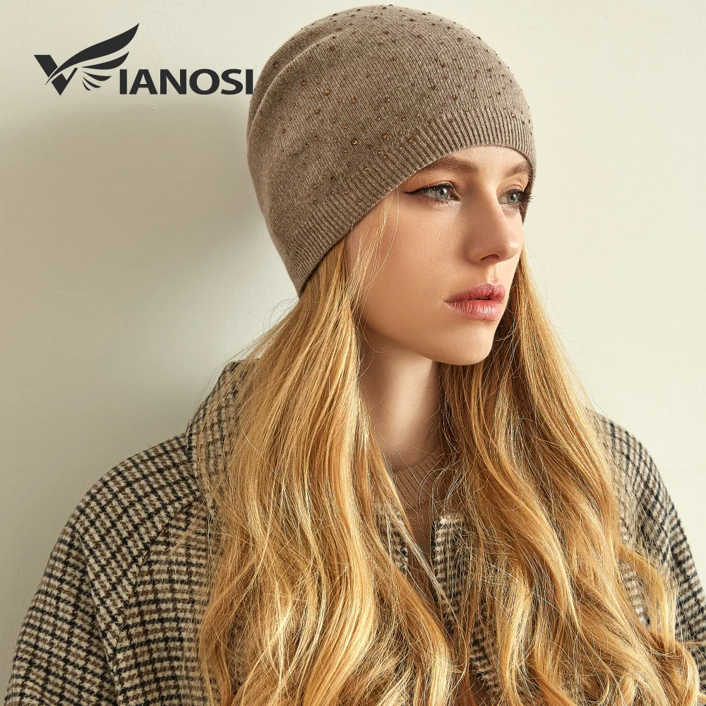 VIANOSI брендовая кашемировая вязаная зимняя женская шапка, плотные женские шапки, теплая шапка, стразы, шерстяные шапки для женщин