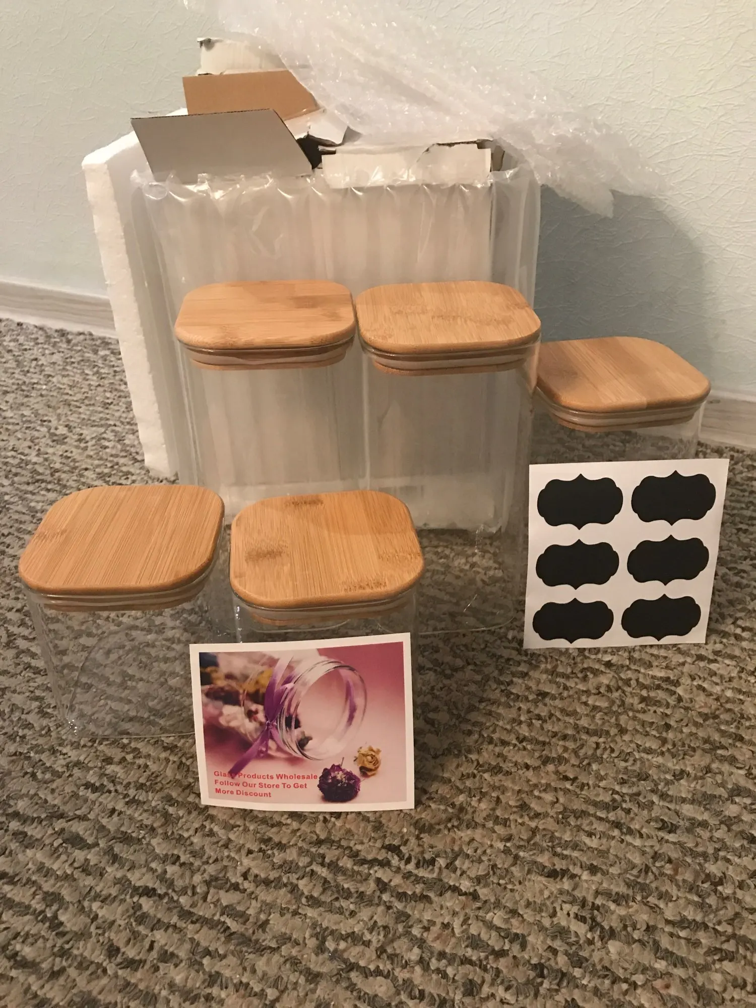 Доставка 1 мес. И 10 дней. Доставили до квартиры. Упаковка в индивидуальных картонных коробках, пенопласт и общая крупная пупырка, пакет. Банки качественные, стекло тонковато, но заучит красиво, значит без дефектов. Крышки плотные. Полностью соответствует фото. Рекомендую. В подарок вложили наклейки на банки. Спасибо
