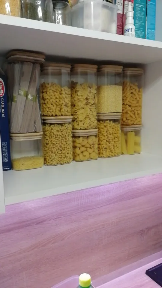 Стеклянные банки с деревянной крышкой. На крышке - клапан, что позволяет плотно закрыть банку. Брал, что бы насекомые не залазили в крупу. В высокую 15 см банку влезает 800 грамм манной крупы. Приходит в противоударной упаковке, так что всё целое.