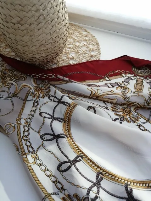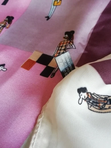 Шикарный платок! Принт яркий, чёткий, края отстрочены аккуратно. Ткань 100% полиестер, на ощупь напоминает атласную. Стирку изделие пережило без проблем, при глажении (и, возможно, в процессе носки) сильно электризуется, имейте это в виду. В целом покупкой довольна, рекомендую всем к приобретению