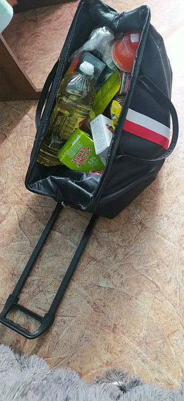 товар пришёл быстро очень, понравилась, сразу испытала, сходила в магазин и тут небольшие проблемы. по ассфальту хорошо едит, где нет его, часто переворачивается сумка. по моему росту 1,68 ручка коротковата, пришлось немного в наклонку идти. а остальное все прекрасно, большой вес выдержела.