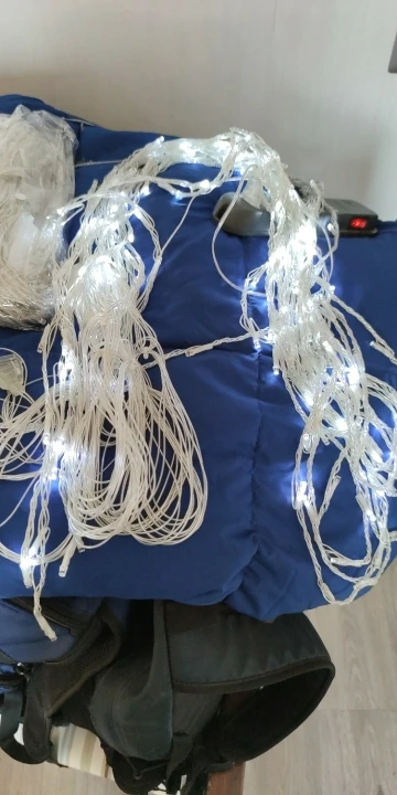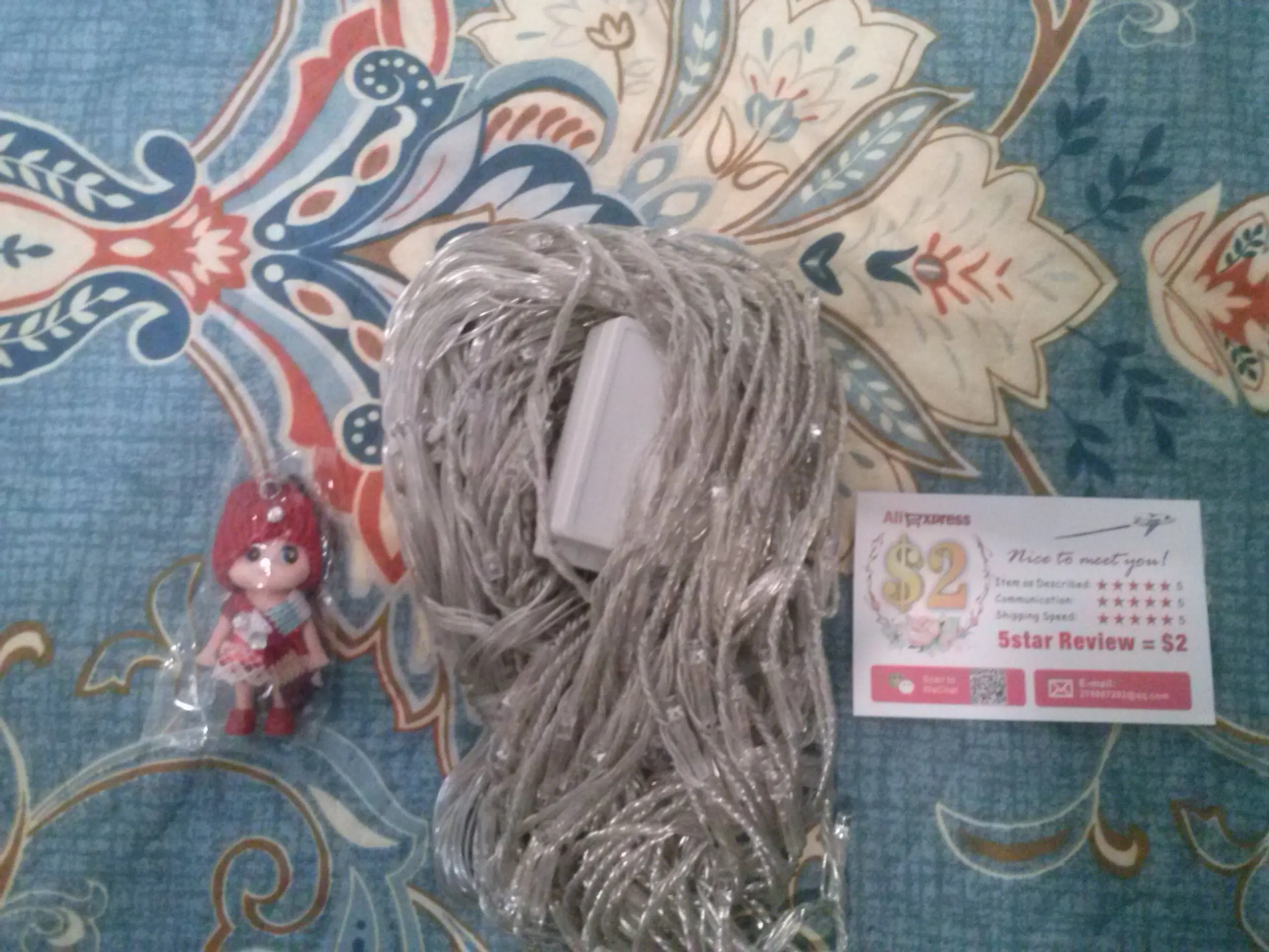 Очень быстрая доставка. Принес домой курьер. Симпатичная, горит как на фото, правда не так эффектно смотрится, потому что нитей мало ( выписала 3 метровый) хотела так же положить как на видео, чтоб был как водопад, но , нет того эффекта, надо несколько гирлянд, повешу на окно , посмотрю как будет, думаю не плохо, продавец положил подарок, симпатичную куколку. будет висеть на ёлке, спасибо