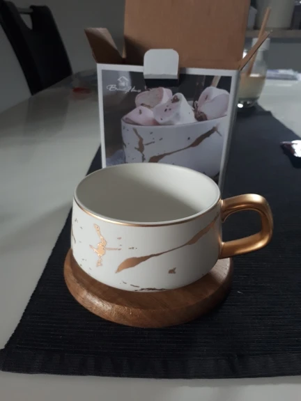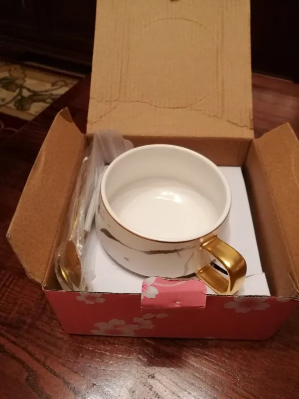 Такая красивая чашка для чая или кофе, фактическая чашка красивая, но я был разочарован в нижней части блюдца. Рисунок не такой красивый, как в Интернете, но все еще в порядке. Общение с продавцом является гладким и хорошее отношение к обслуживанию. Я рекомендую. Спасибо за подарок.