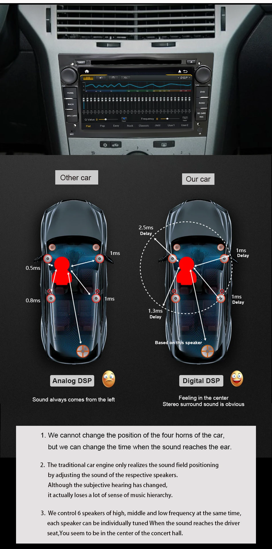 Радио с RDS, оригинальный импорт TDA 7851Поддержка FM.AM, вы можете установить эквалайзерДля того чтобы выбрать звукЭффектов и расположение