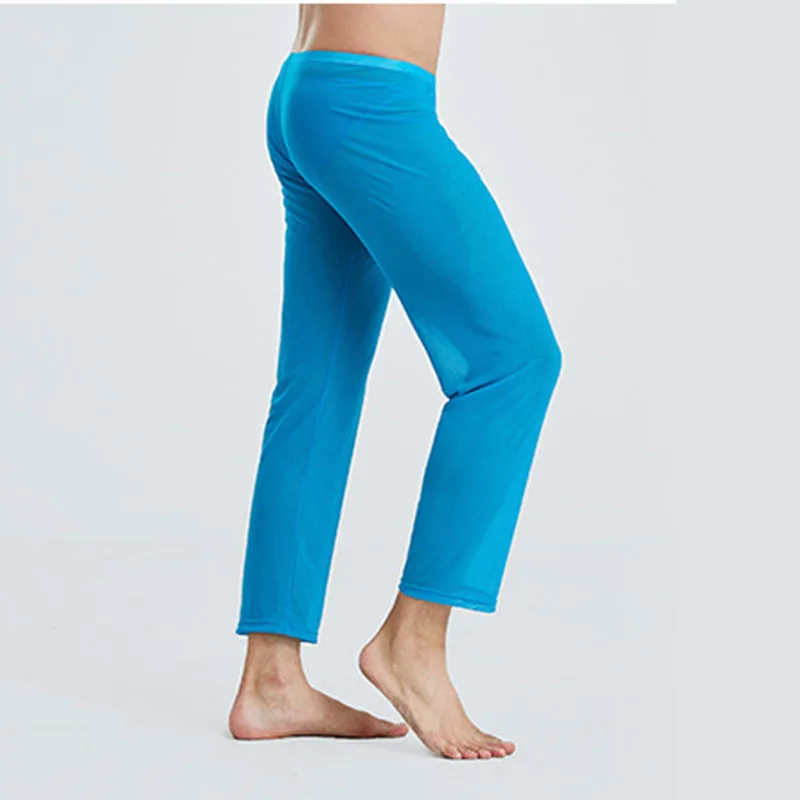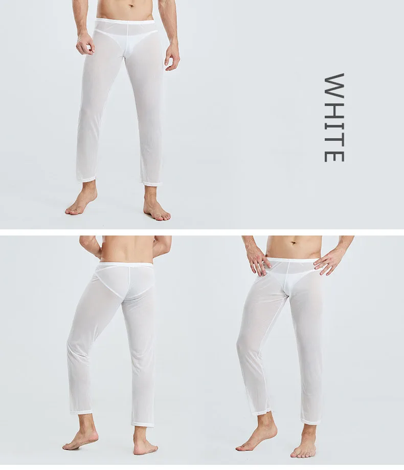 Пижама для мужчин, одежда для дома, Мужская прозрачная Пижама, Сетчатое сексуальное нижнее белье, домашние штаны, эластичные пижамные штаны