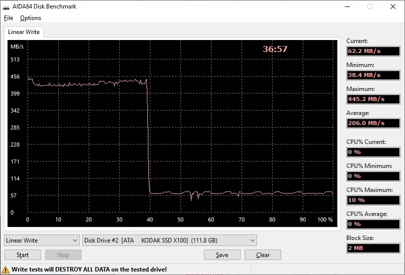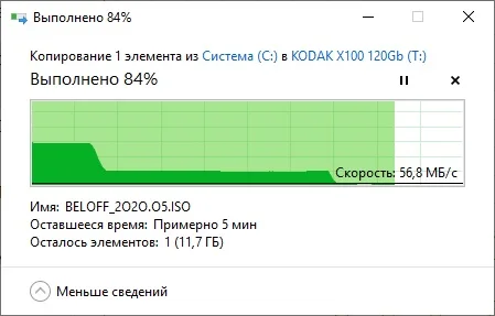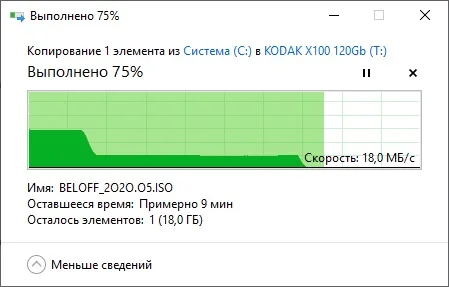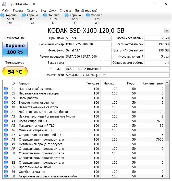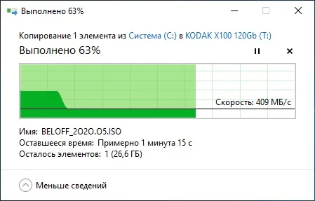 Товар отправлен быстро. Посылка шла 24 дня в ХМАО г. Нижневартовск. Корпус SSD диска KODAK X100 выполнен из металла, хорошо отводит тепло. На диске установлен термодатчик, во время тестирования диска нагрелся максимум до 54˚С. Диск обладает хорошими скоростными характеристиками. На диске KODAK X100 имеется SLC-кэш в размере 50 Гб, скорость записи в пределах которого 400-420 МБ/с, дальше скорость записи падает до 50-60 МБ/с, с просадками до 18 МБ/с. Хотя вряд ли кто будет записывать за раз более 50 Гб на SSD диск KODAK X100, так что такие просадки скорости записи можно будет увидеть только во время тестирования SSD. Покупкой доволен, можно смело заказывать. Спасибо продавцу!