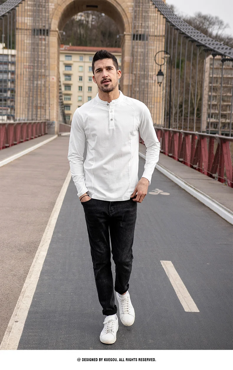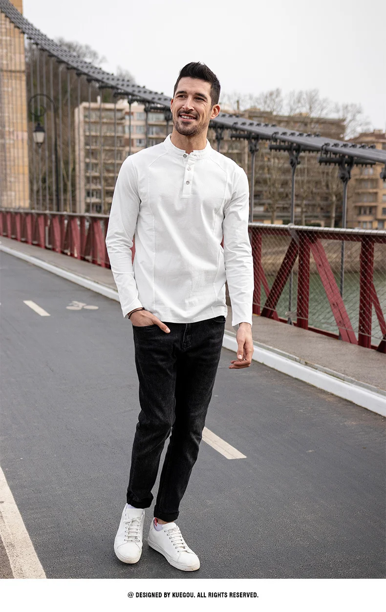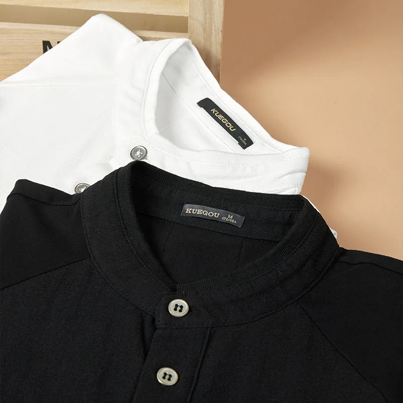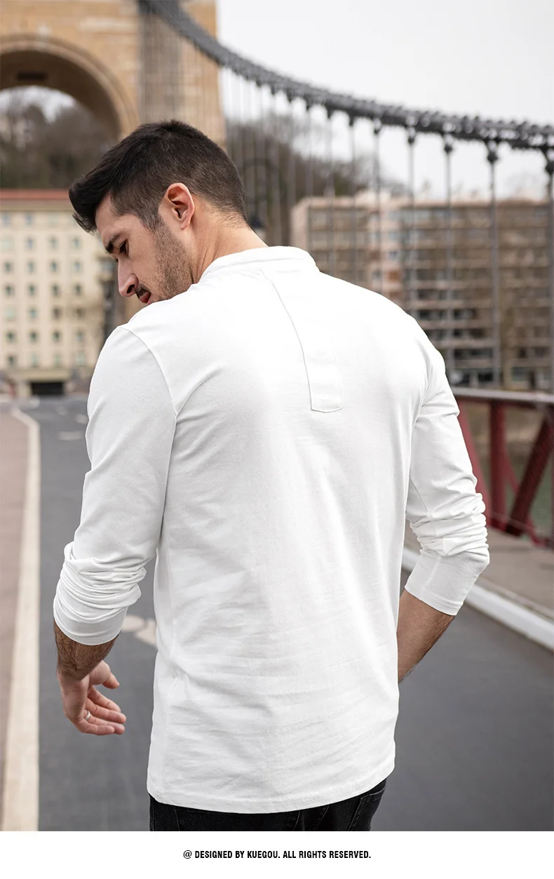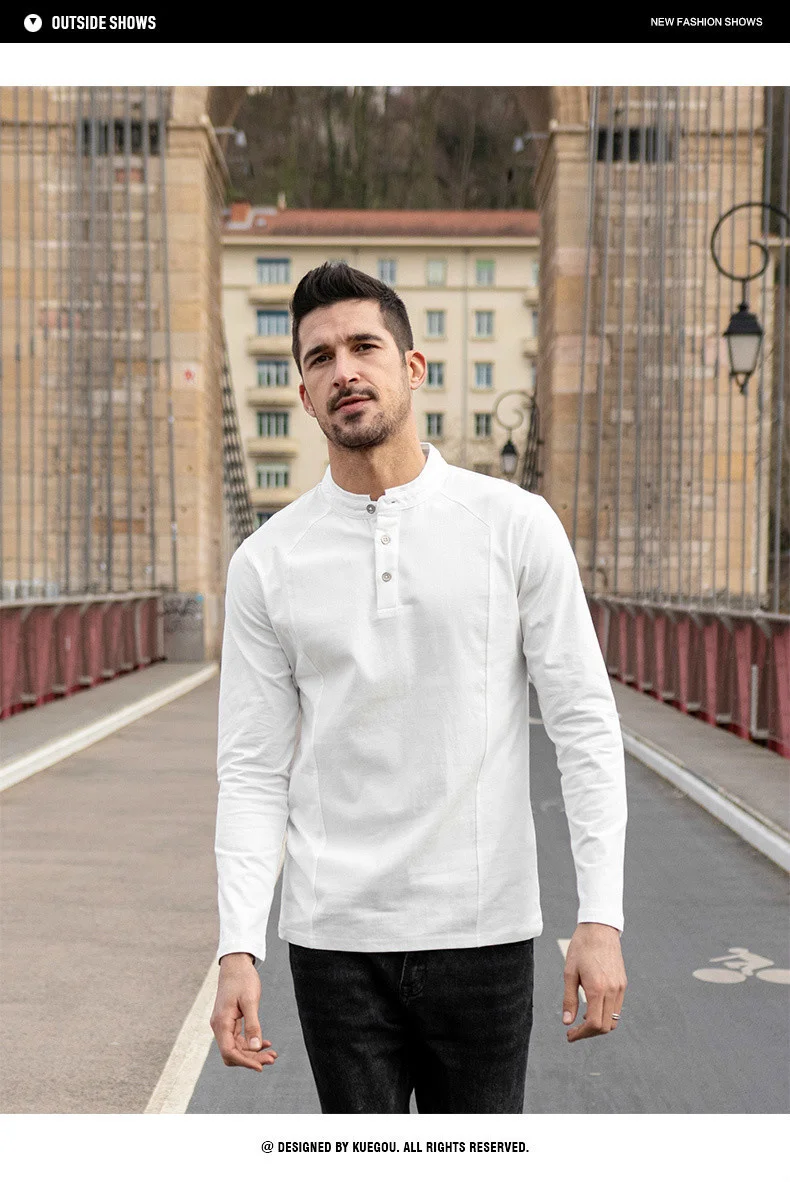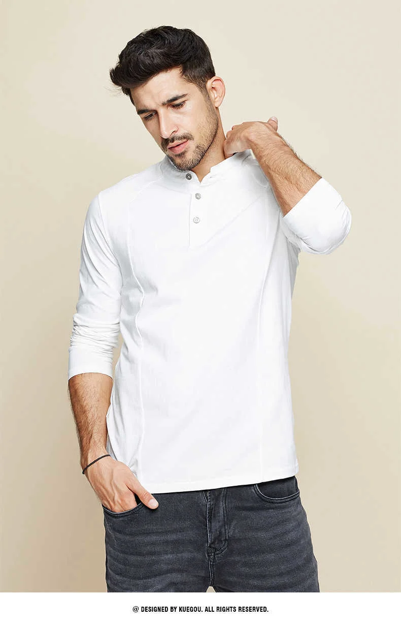 KUEGOU 2022 Весенняя хлопковая Простая белая футболка с пуговицами Мужская футболка брендовая футболка с длинными рукавами Мужская одежда размера плюс 1306