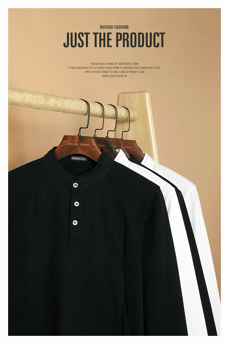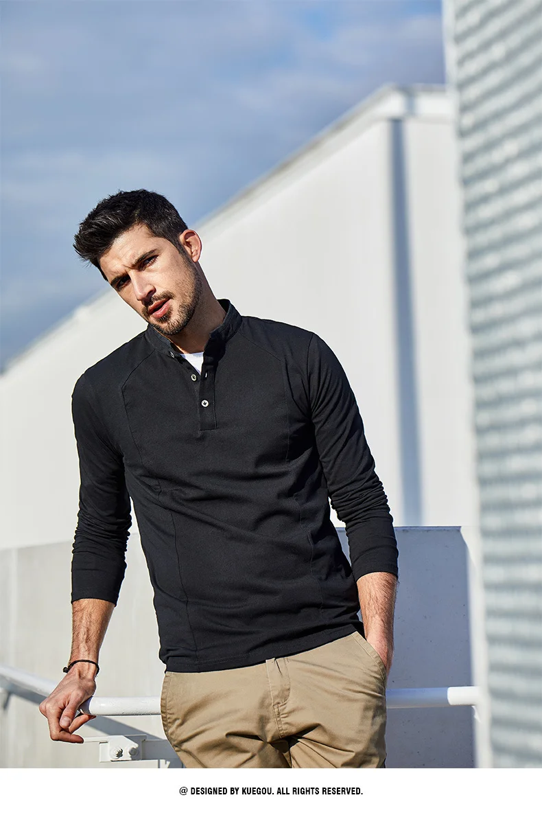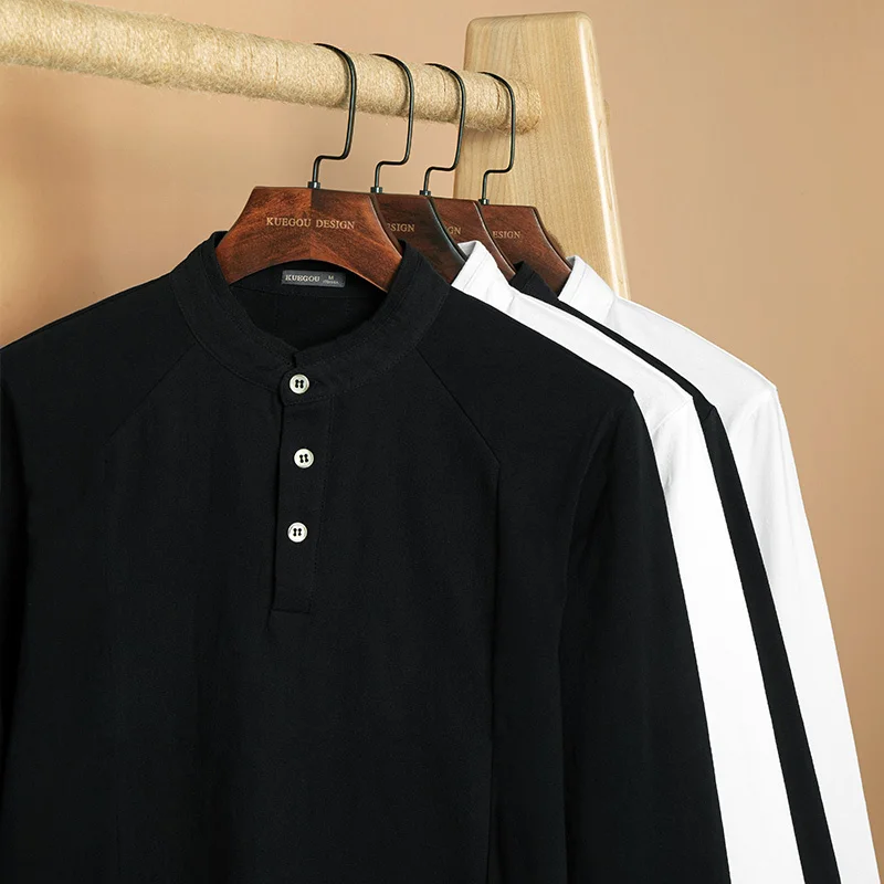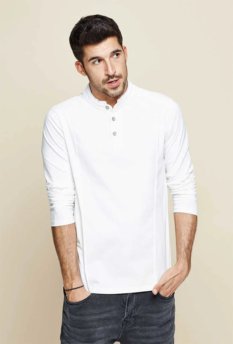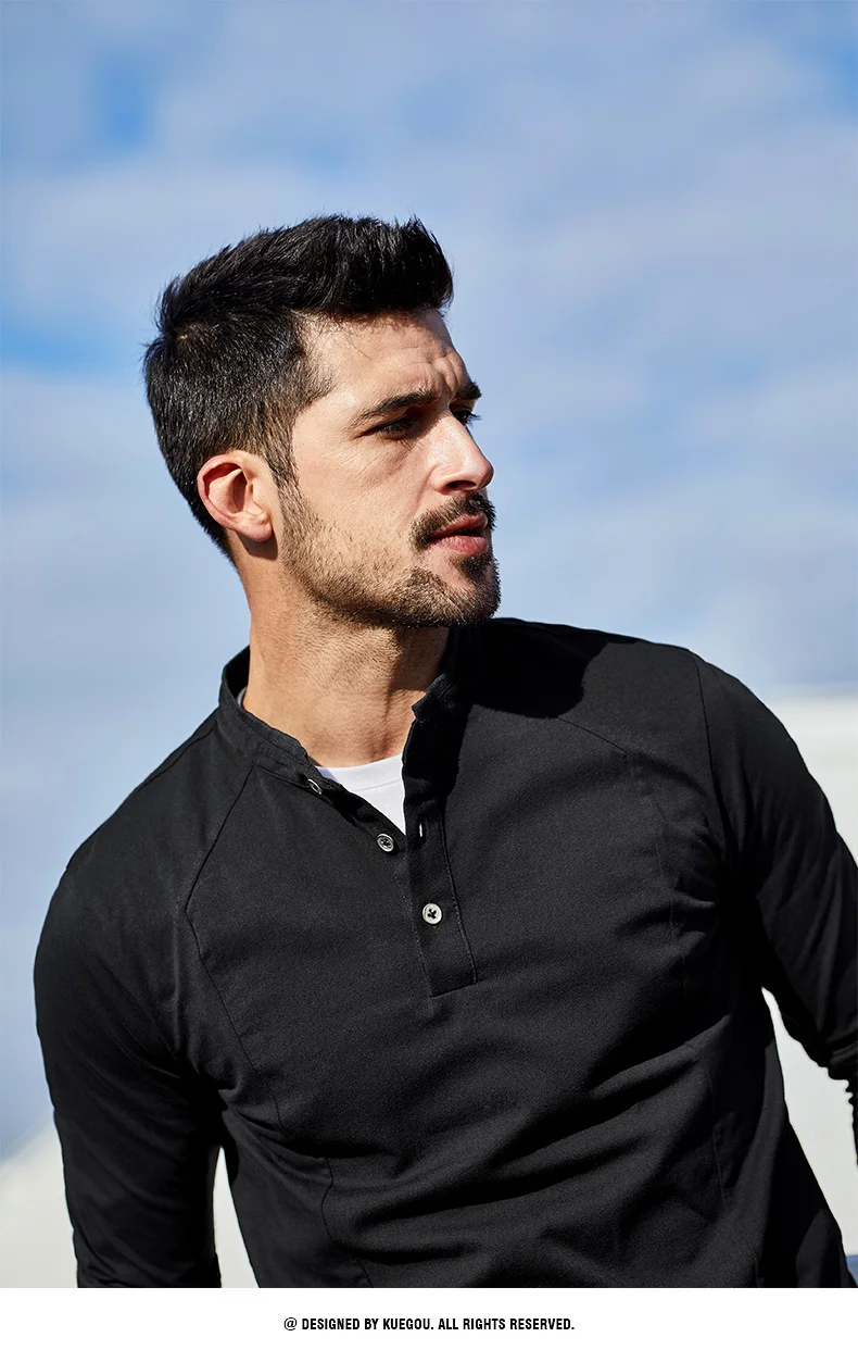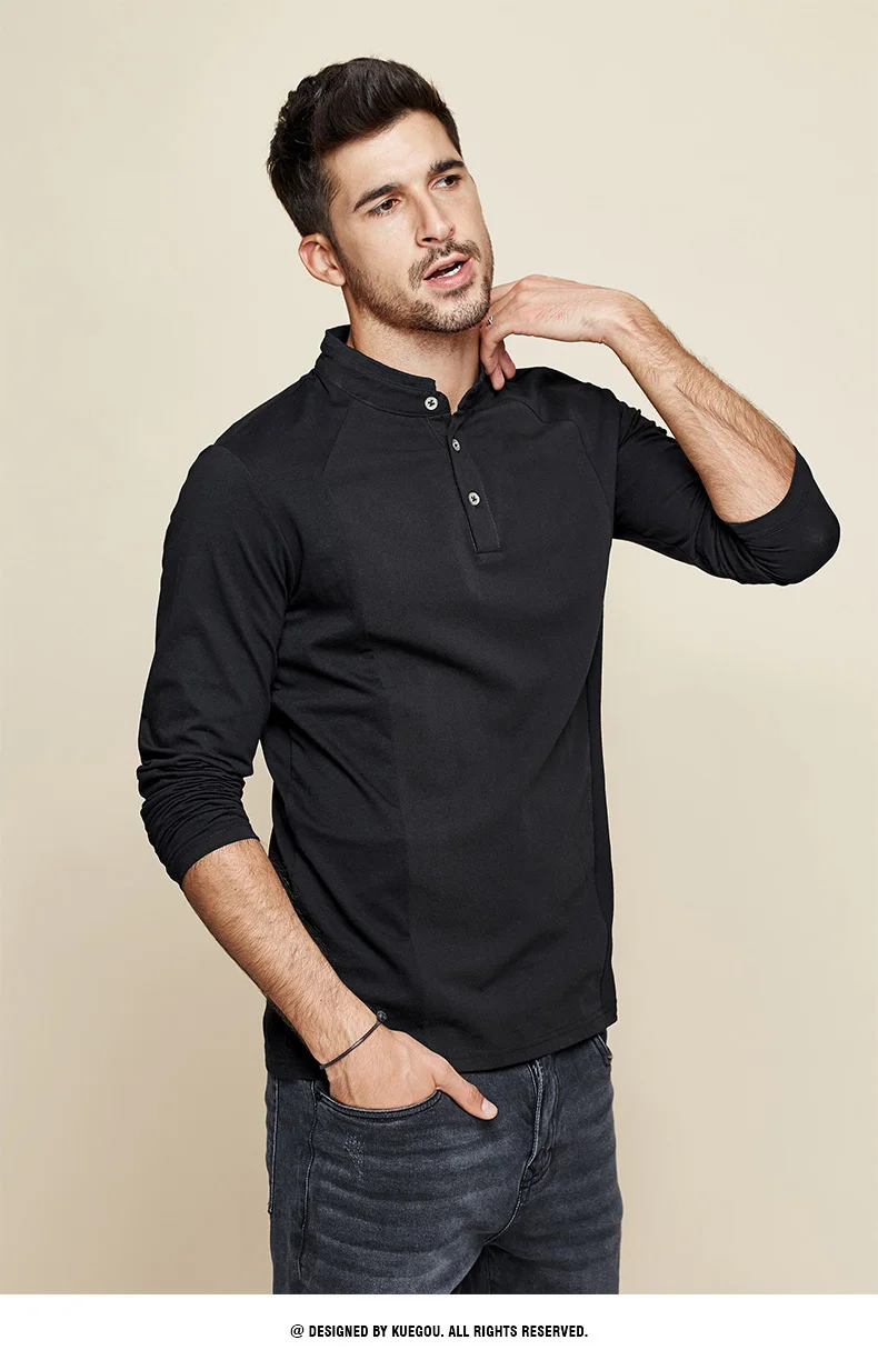 KUEGOU 2022 Весенняя хлопковая Простая белая футболка с пуговицами Мужская футболка брендовая футболка с длинными рукавами Мужская одежда размера плюс 1306