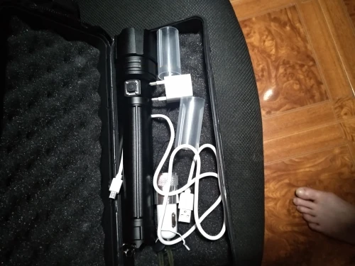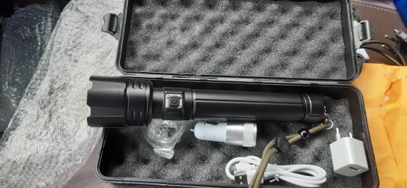 фонарик работает,пришёл заряженный, кейс с обломаными замками видно повредился при транспортировке но это не важно фонарик огонь!все адаптеры в комплекте.доставка была достаточно долгой 40 дней. товаром доволен респект продавцу!