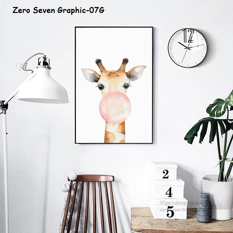 Акварельные животные, жираф, коала, Панда Ест жевательную резинку, пузыри, холст, печать, картина, настенный художественный плакат для украшения детской комнаты