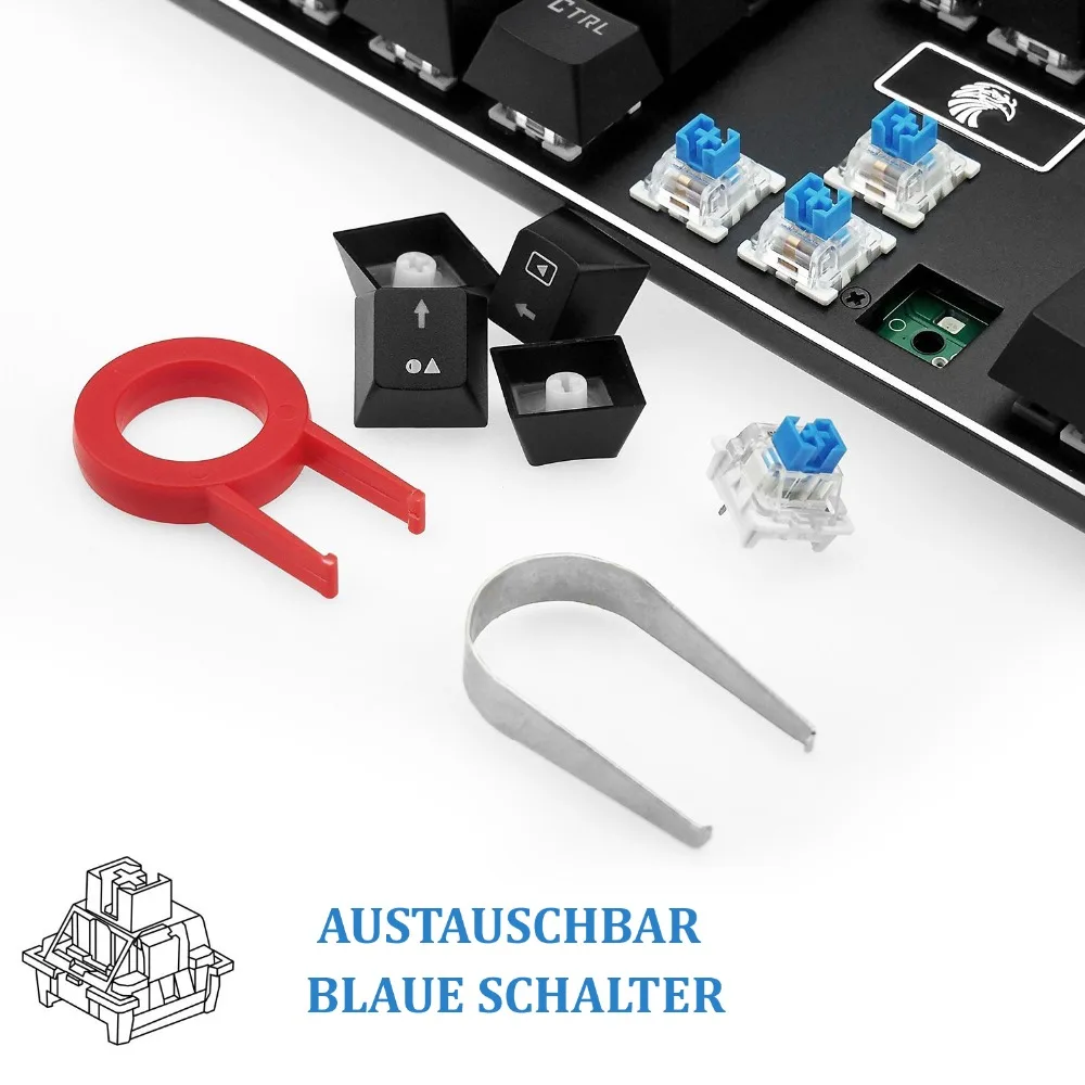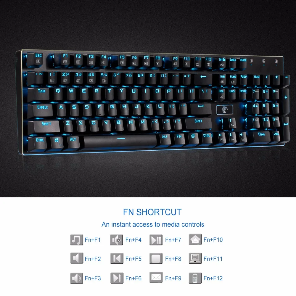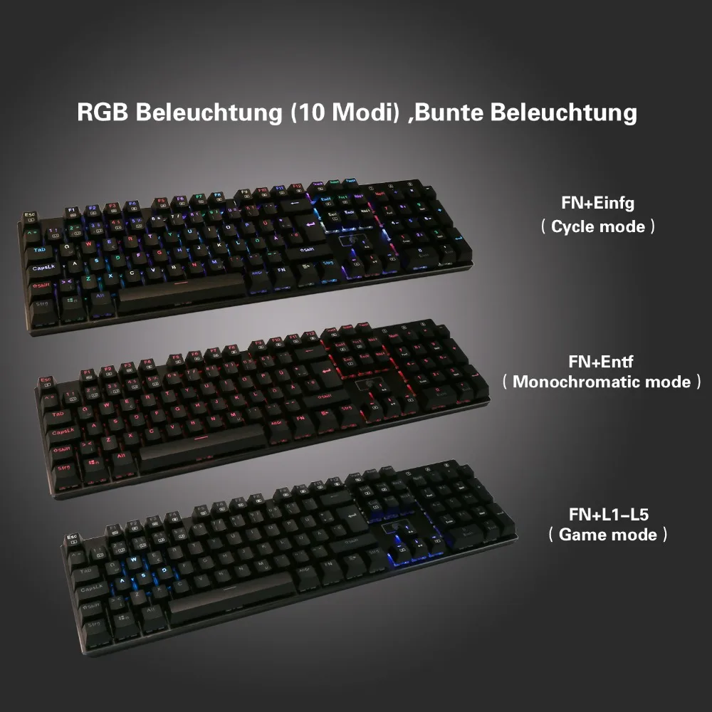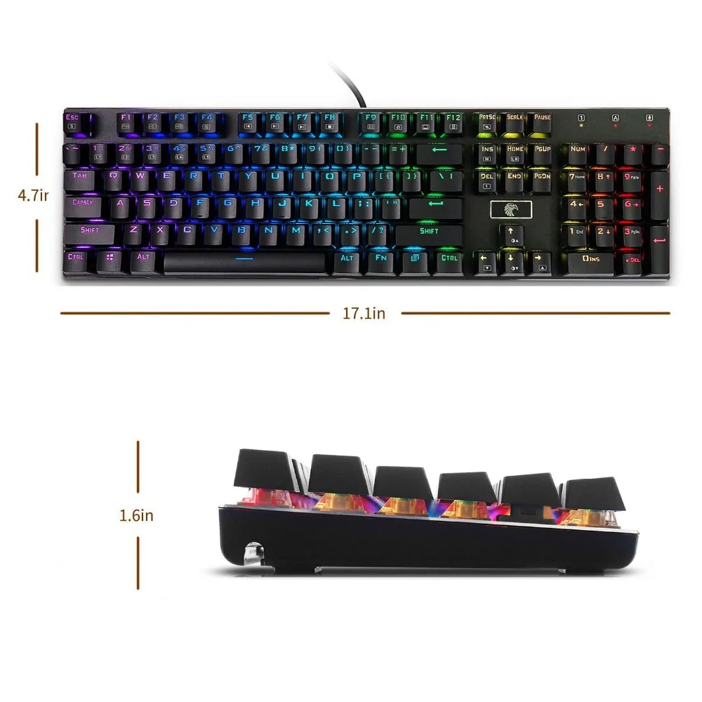 ❤Защита от привидения 104 ключа. N-key rollover▶Позволяет использовать несколько клавиш одновременно с высокой скоростью. Каждая клавиша управляется независимым переключателем, позволяя вам наслаждаться высококачественными играми с быстрым откликом. ❤Outemu инновационные подключаемые синие переключатели▶Пользовательские механические переключатели предназначены для долговечности, отзывчивости и долговечности. Механические клавиши со средним сопротивлением, звуковым нажатием и тактильные отзывы. Тест на нажатие клавиш в 50 миллионов раз. Включает 5 запасных переключателей для замены. ❤Программируемая подсветка RGB▶Вы можете программировать все ключи, чтобы быть одинаковым цветом/какой цвет вы хотите без драйвера. Предустановленный 10 RGB режим подсветки с Fn + Ins. Есть сплошной цвет с подсветкой. Двойные колпачки для кристально чистого заднего освещения для экстремальной долговечности ❤Ключевые ярлыки и эргономичный дизайн▶Легкий доступ к калькулятору, электронной почте, веб-браузеру, громкости, мультимедиа и т. Д. С FN + F1-F12. Эргономичный дизайн: шаговый колпачок делает его гладким, дугой и наклоном, чтобы предотвратить усталость рук. Обеспечивает блокировку ключа Windows для игр ❤Одежда высшего качества▶Высококачественный металл и конструкция ABS, позолоченная USB стойка для соединителей до игр hardcore.
