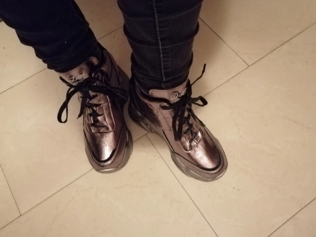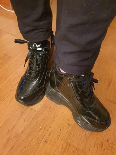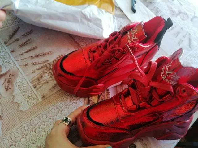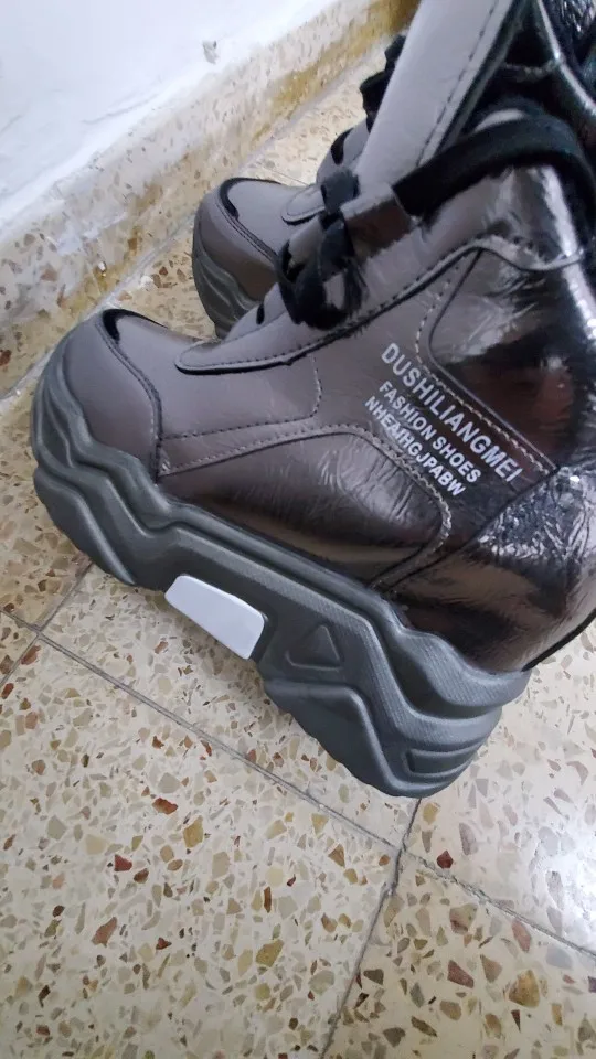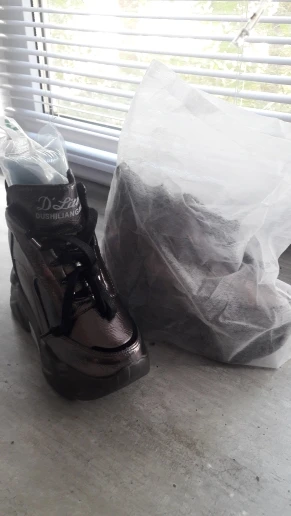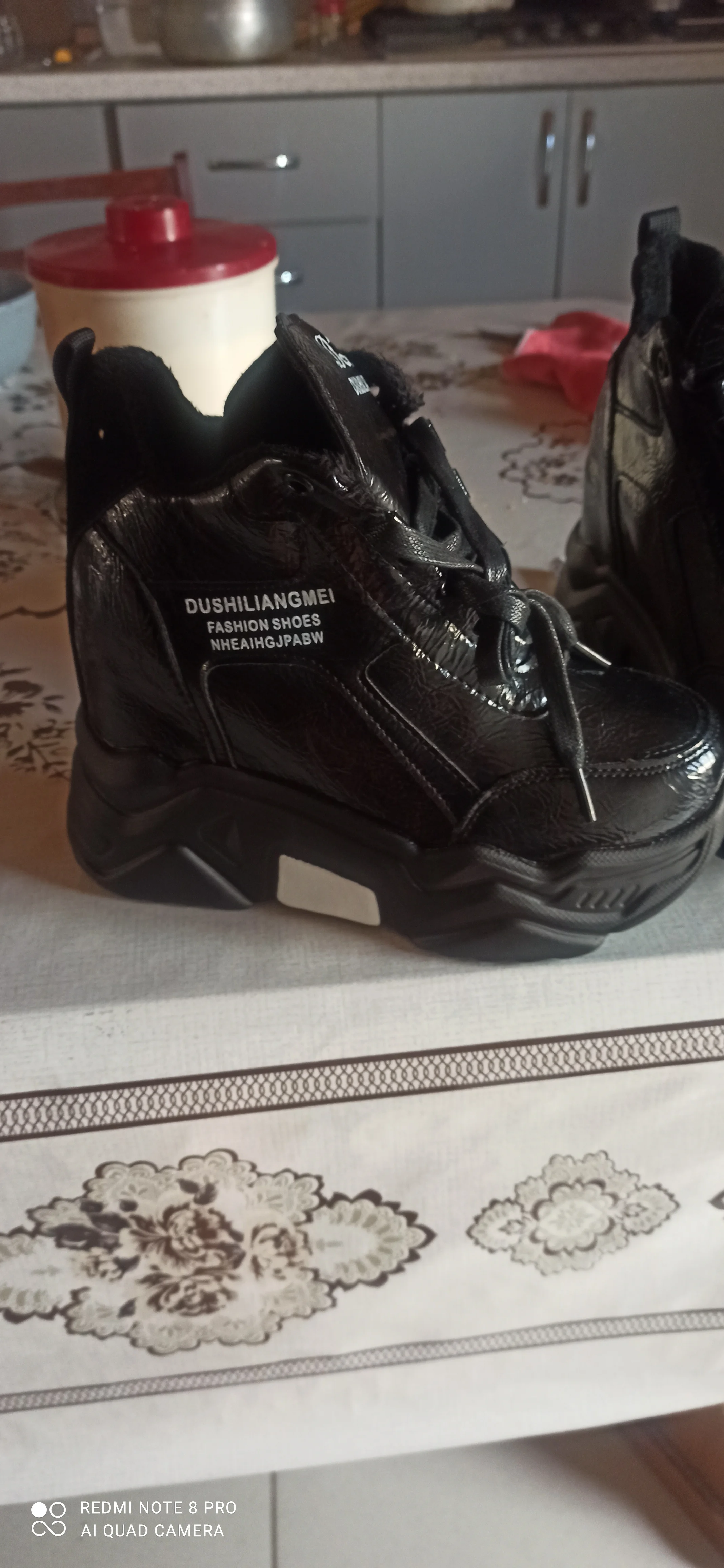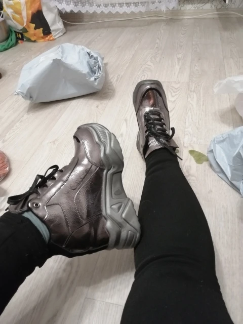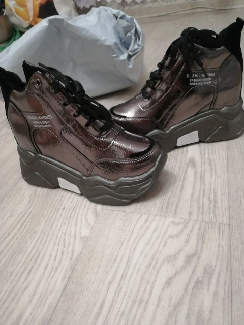 очень порадовала упаковка, в нутри воздушные пакеты, каждый башмак в индивидуальном мешочке и упакованы в надувной пакет, кроссовки даже не помялись. очень легкие и удобные. с небольшой опушкой (ездить на автомобиле идеальный вариант, ноги не вспотеют а на улице не замерзнут) высокая платформа тоже плюс, выше от промерзлой земли или луж и жижи от снега. Я довольна!