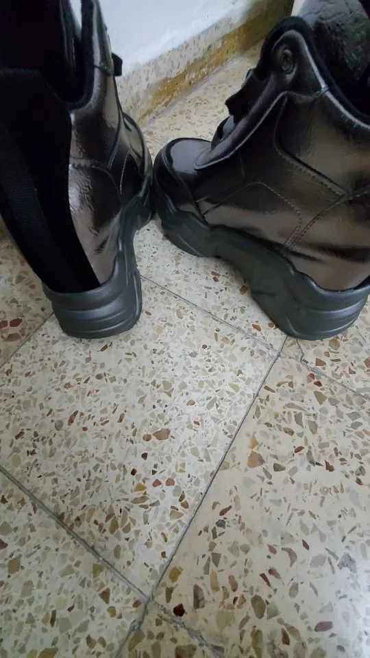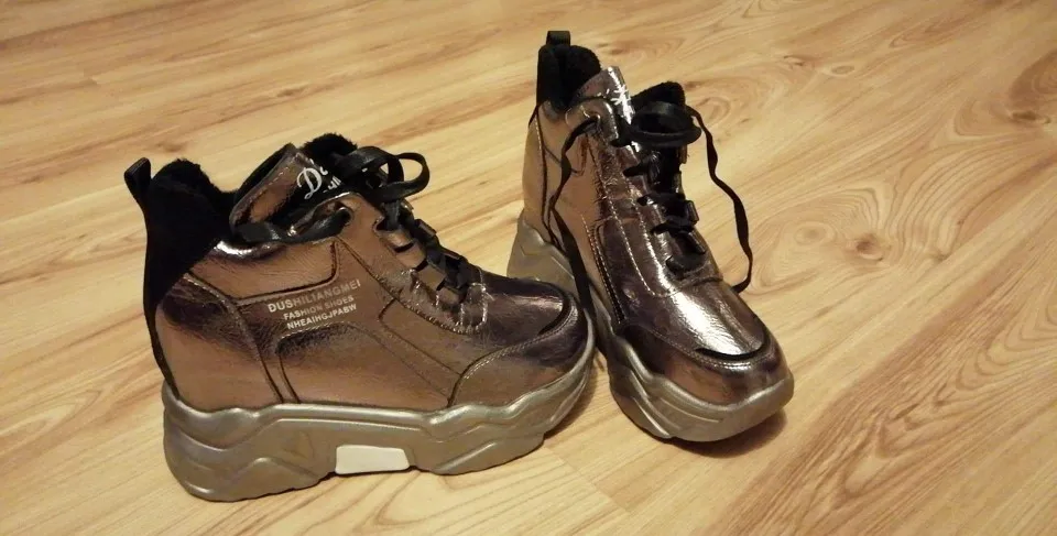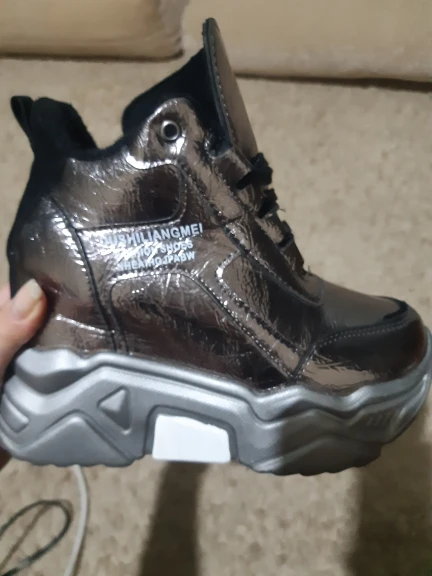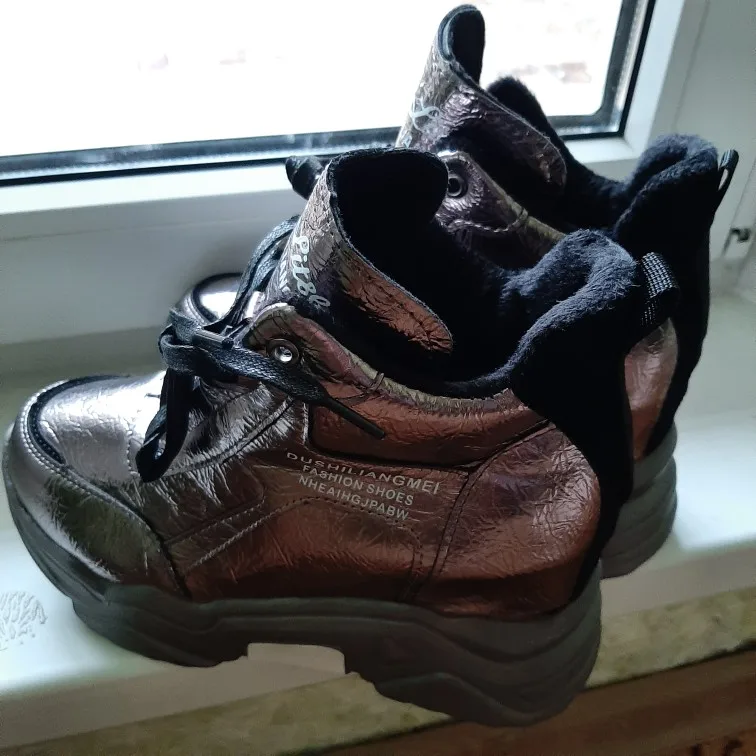 Очень удобная обувь с мехом внутри. Достаточно высокий. Цвет немного отличается от изображения, более медный, чем серебристый. Изысканные, не rozklejajj. За эту цену очень хорошо. У меня есть ступня 24,5 см, и размер 39 подходит.
