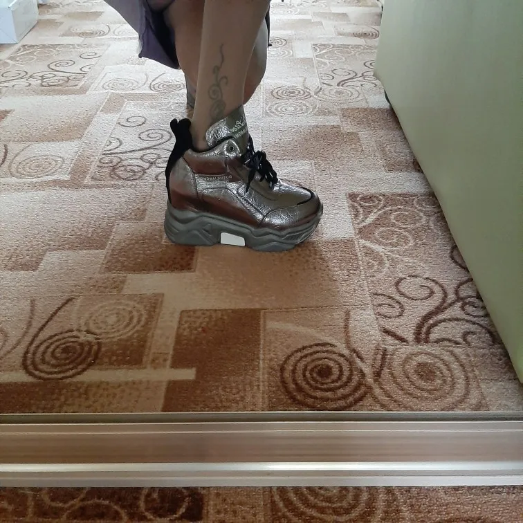 Обувь смотрится стильно)На мой 37 взяла 38,в принципе можно было и 39 брать.Скрытая танкетка довольно высокая,по этой причине нога как бы съезжает к носку.Качество удовлетворительное)Но внешний вид,кто не особо разглядывает—прикольный.