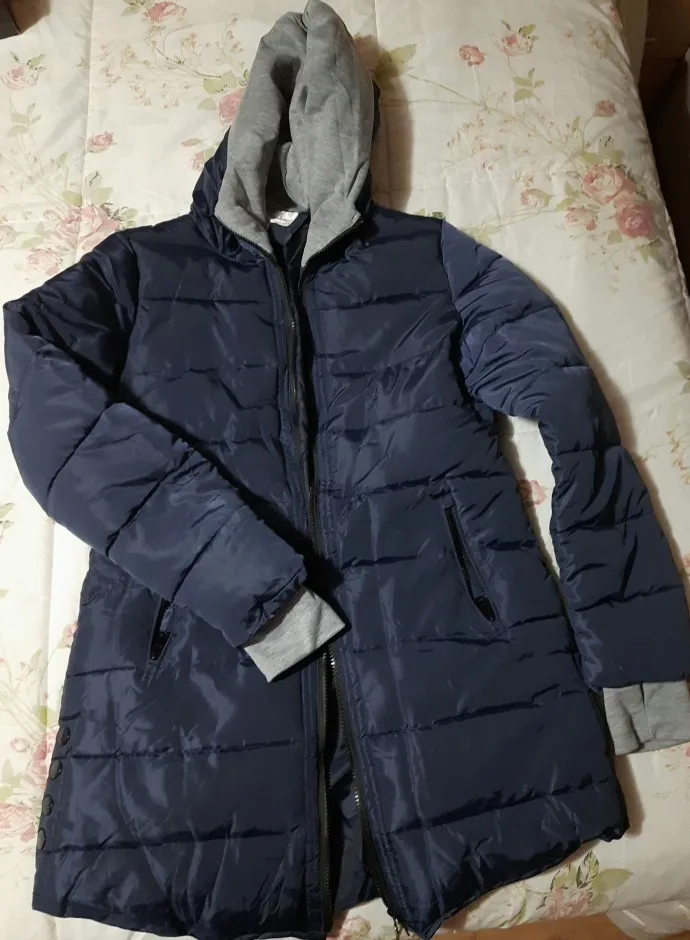 Куртка на весну-осень хорошего пошива с карманами на молнии и капюшоном, не очень тонкая, но и не толстая, вроде синтепоновая. Размер L на 42р-р подошёл. Цвет синий тёмный красивый. Доставка около месяца.