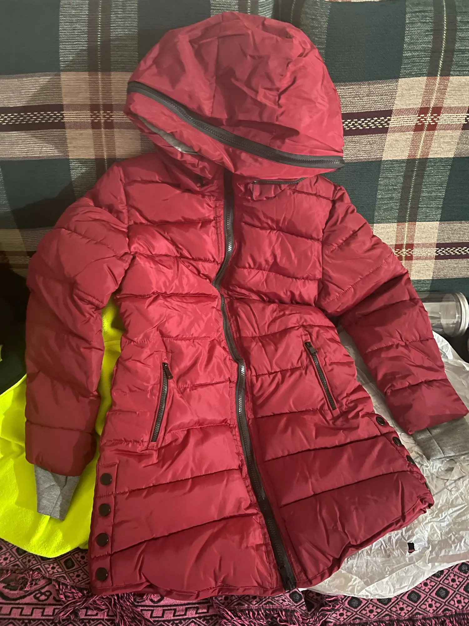 ha tardado 17 días en llegar a Madrid,no 10 como dicen. el embalaje muy cutre,una bolsa muy apretetada,si llegan a clavarle algo se hubiera roto el abrigo. el vendedor me aconsejó ésta talla para mis medidas,mido 165 cm y peso 55 kg,uso una 38-40 y el abrigo me está bien,no sé si una talla menos hubiera estado bien. el color rosa es preciso,estoy contenta aunque la cremallera no me da mucha confianza,parece muy frágil. me ha costado 13,77€.