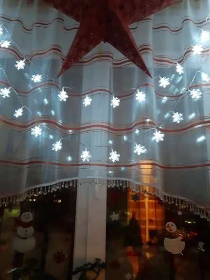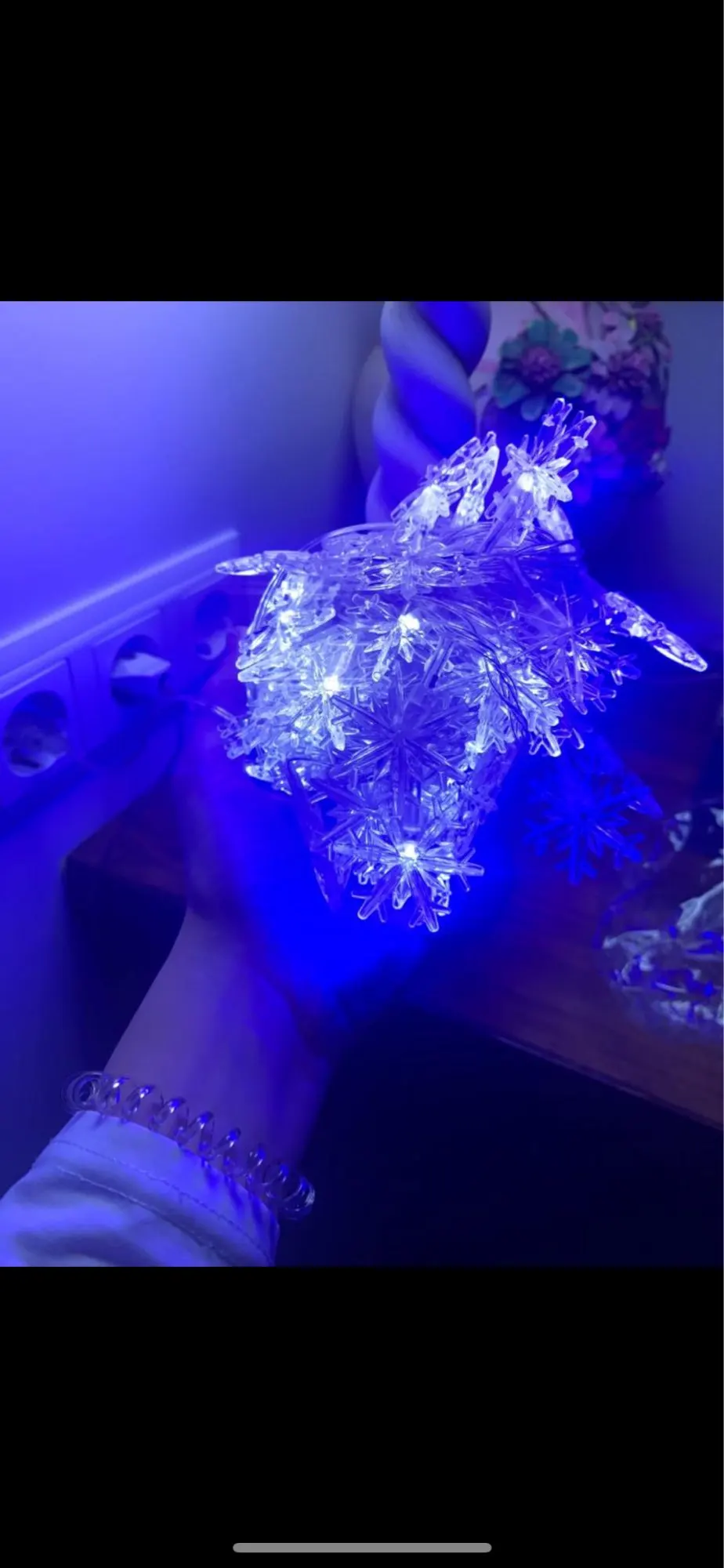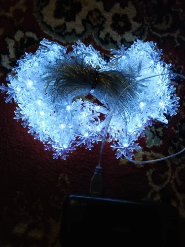 очень красивая гирлянда. все снежинки горят. работает от батареек, что очень удобно, не нужно искать розетку. батареек в комплекте нет, пришла быстро, как раз к новому году! спасибо!