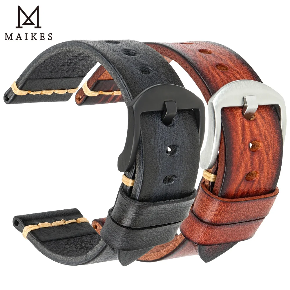 Ремешок для часов MAIKES ручной работы из коровьей кожи, винтажный ремешок для часов с пряжкой из нержавеющей стали для Panerai, Omega, SEIKO CITIZEN