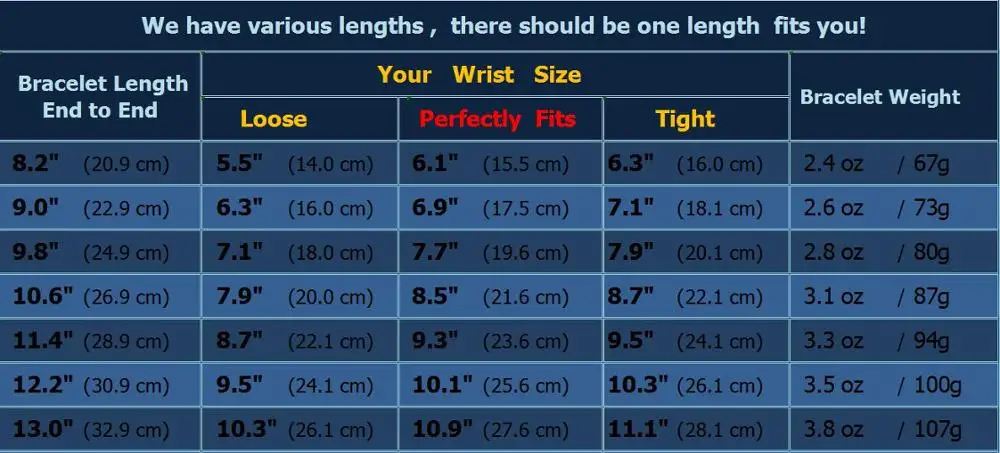 Как выбрать правильный размер?1:Измерьте размер запястья.(Пожалуйста, посмотрите на последнюю картинку, которая показывает, как измерить ваше запястье)2:Пожалуйста, посмотрите на таблицу размеров ниже и убедитесь, что ваш размер близок к"Идеально подходит" размер запястья, тогда вы будете знать, какая длина браслета подходит для вас(Если вам нравится браслет более свободный, пожалуйста, убедитесь, что размер запястья близок к размеру свободного кроя)