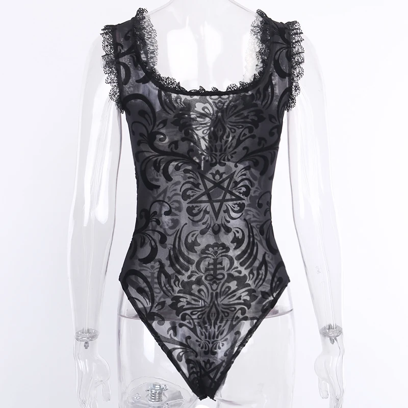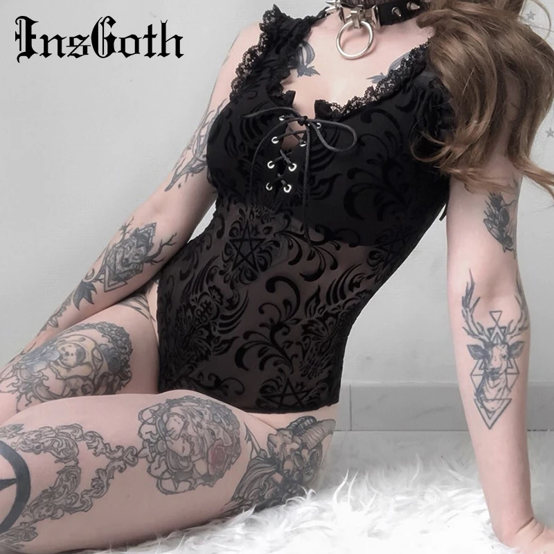 Женский кружевной комбидресс InsGoth, сетчатый облегающий комбидресс без рукавов, черного цвета, для вечеринок, в готическом стиле