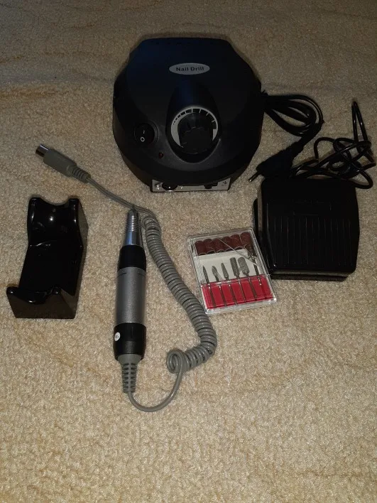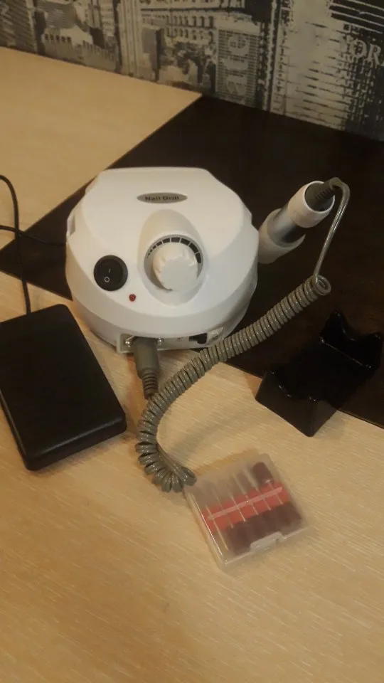 Заказывала из России, пришла в Пермский край за 5 дней, получала на почте. Упакована хорошо в надувной пакет, коробки не было. В комплекте фрезы, педаль, ручка, шнур, подставки. Корпус не поврежден. Ручка не пластик. Пользовалась самостоятельно впервые, сразу разобралась что и где. Спереди кнопка включения, реверс, сзади кнопка включения педали, разъем для педали. Работает не очень шумно, ручка вроде не вибрирует. Насчёт качества фрез ничего сказать не могу, т.к. сравниввть не с чем, прочитала в отзывах, что плохие и заказала другие, жду. Попробовала убрать кутикулу - справилась, убрать онихогрифоз на ногах - спилила на ура, чем очень впечатлила, а вот с сухой кожей на стопе пришлось повозиться, не идеально, но справилась. Может и правда нужны другие фрезы. Для домашнего использования считаю отличная вещь, для салона и т. д. наверное слабовата. В целом очень довольна, не пожалела, что заказала.