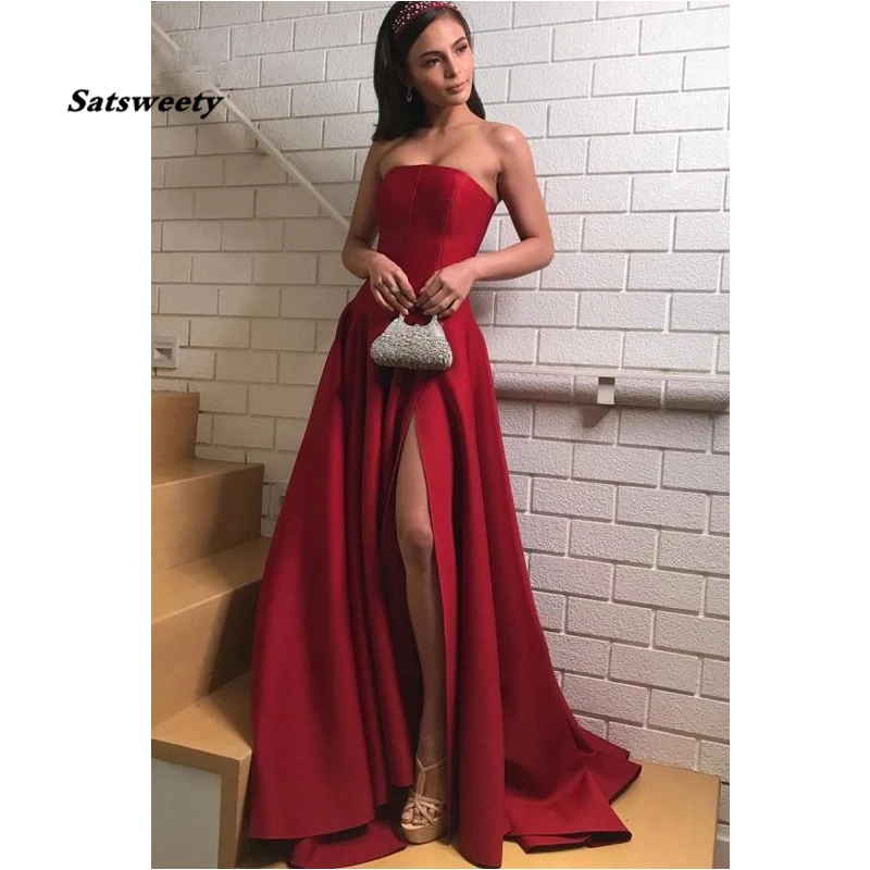 Бордовое мусульманское вечернее платье 2022, атласные темно-красные платья без бретелек для выпускного вечера с Боковым Разрезом, длинное вечернее платье, abendkleider