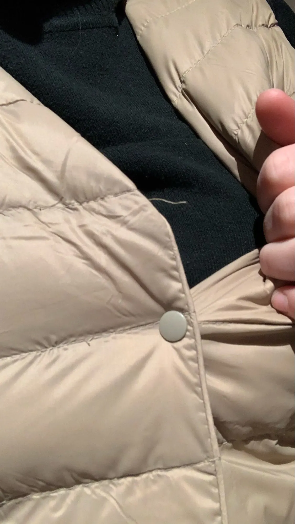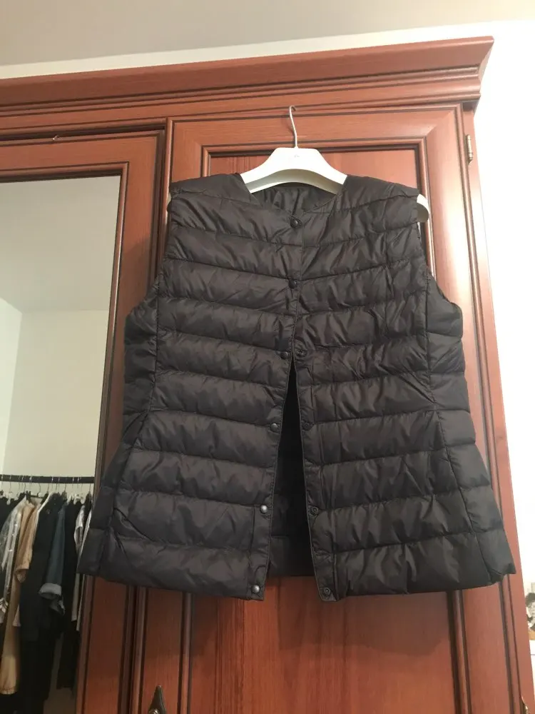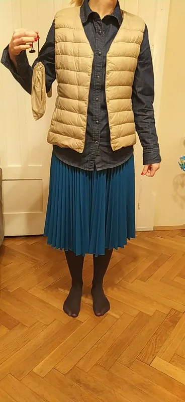 Если вы купили чёрную куртку (ультралёгкую) с Uniqlo, то жилет будет кардинально отличаться по цвету/ оттенку. Если надели чёрную одежду внутрь, встречайте пух по всей ткани. Прошивка не очень качественная, везде подрезала нитки, по всей внешней части жилета. С заклёпками аккуратнее, без резких движений, иначе оторвёте с корнем. Но жилет действительно: тёплый, легкий, удобный, не просвечивает. Идеально сел XL на мои параметры (размер S, рост 163см, 85-64-91). Близко к телу. Нигде не жмёт. Могу надеть с толстовкой/свитером. Быстро доставили. Не жалею о покупке, но ожидала лучшего.