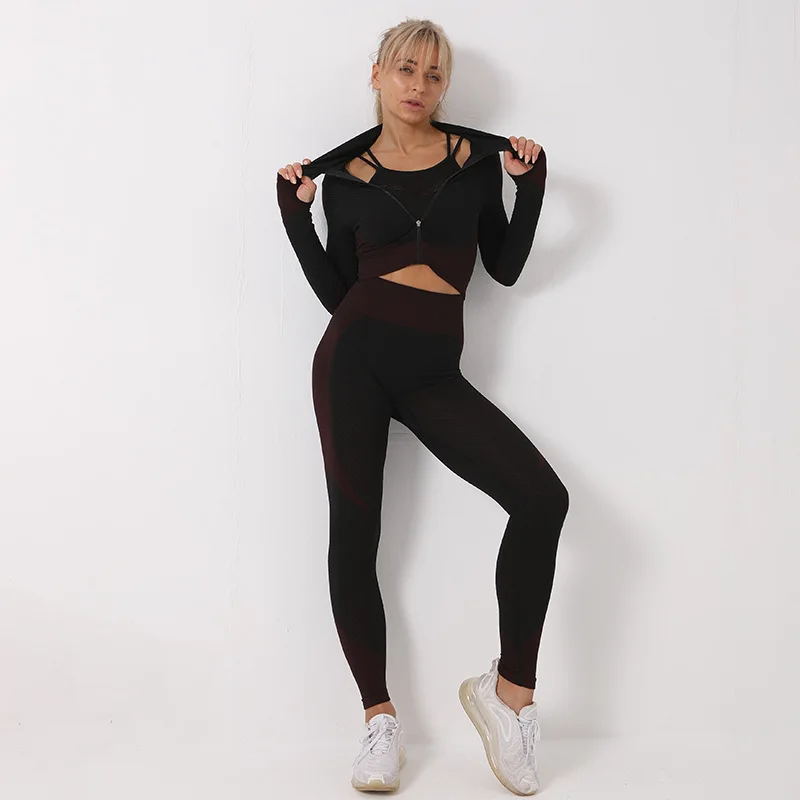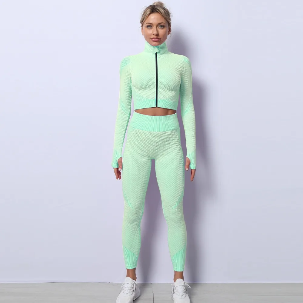 Женский спортивный костюм из 2 предметов, одежда для тренировок в тренажерном зале, укороченный топ на молнии с длинным рукавом, бесшовные леггинсы с высокой талией, комплект для йоги