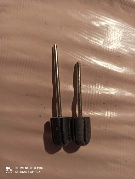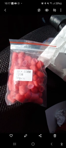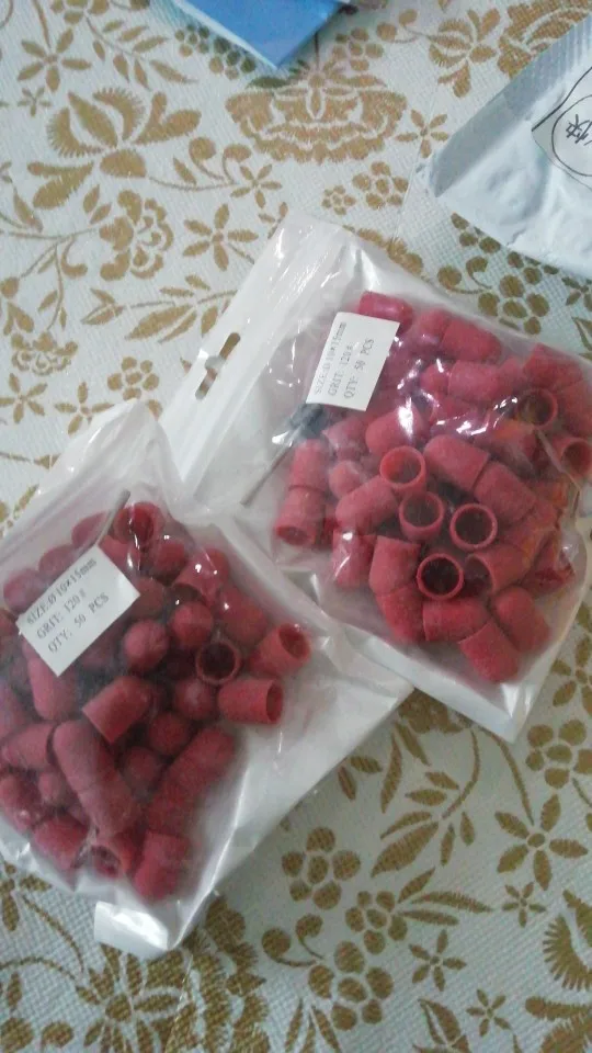 Качество напыления абразива на 3. Местами видны проплешины. На фото проплешины на синем цвете видны плохо, поэтому выложила фото из второй заказанной пачки. Резиновые насадки были вложены в обе пачки. Они пришли с разными длинами хвостовика