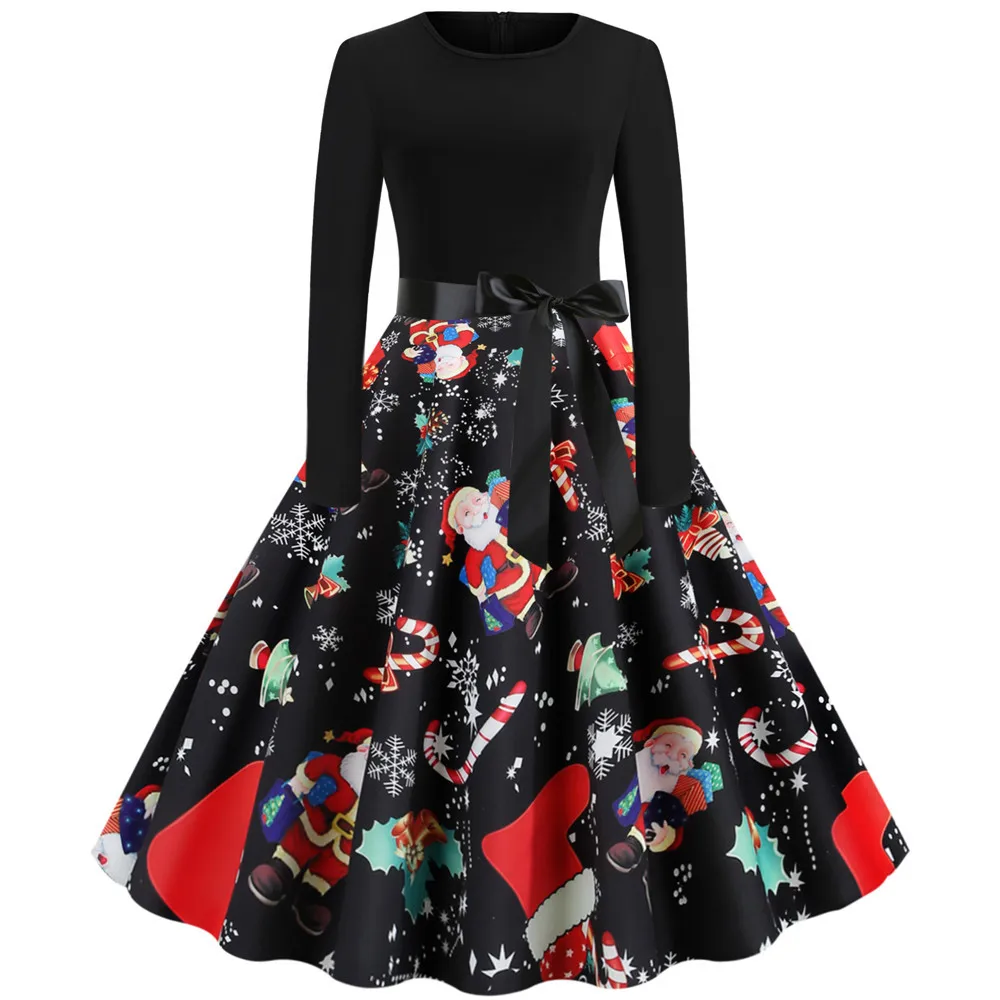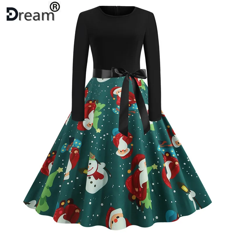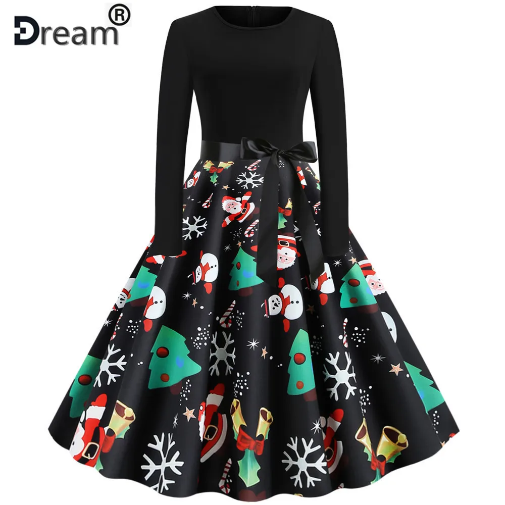 Женское винтажное платье с длинным рукавом, праздничное платье-трапеция в стиле 50-60-х годов с рождественским принтом, Осень-зима