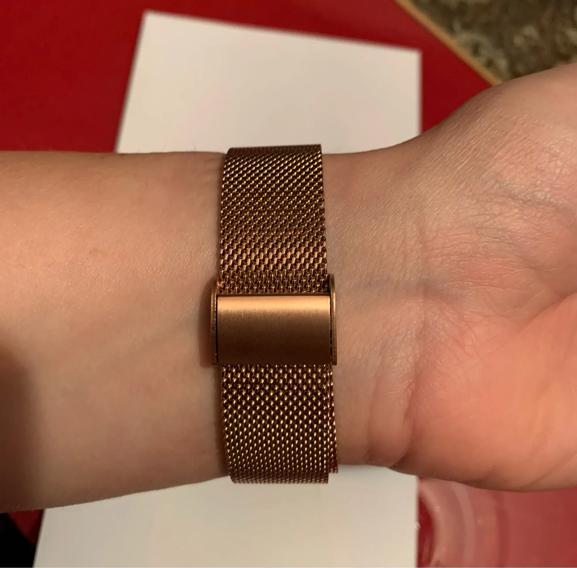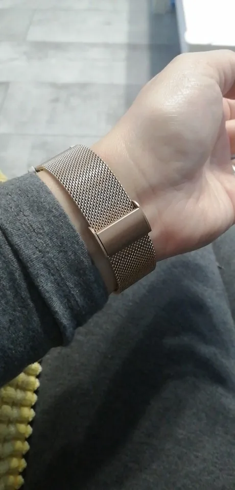 Выглядит отлично и комфортно, не совсем такой цвет, как הчасы из розового золота, но не отличается большим количеством. Застежка удобная и безопасная.