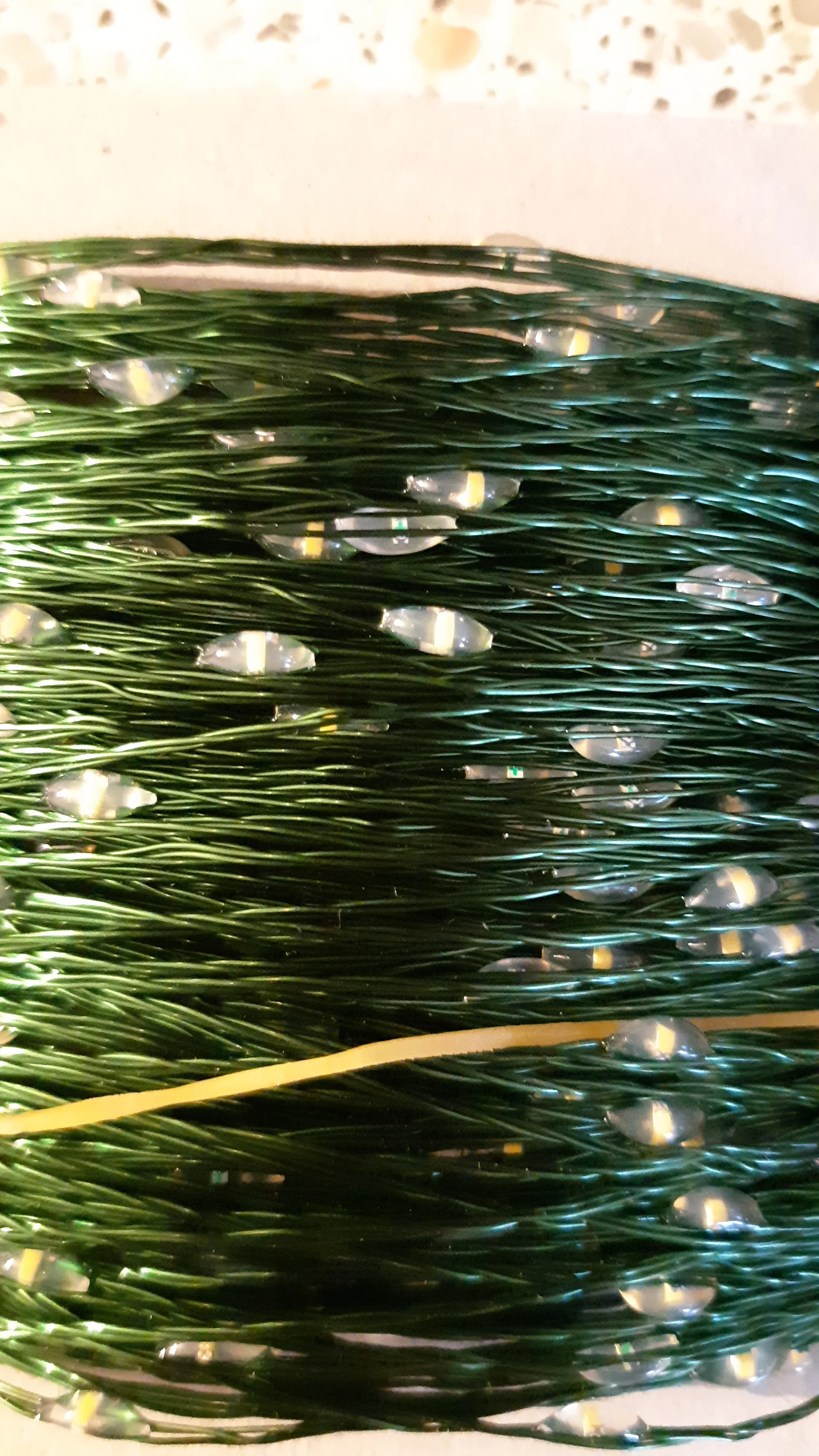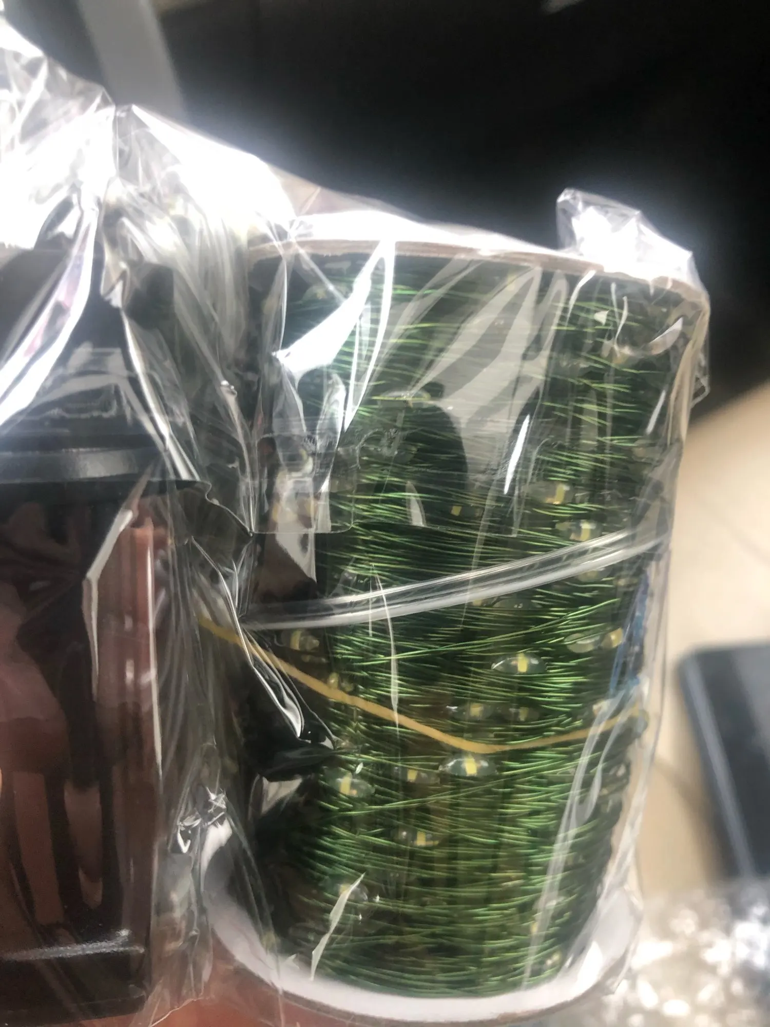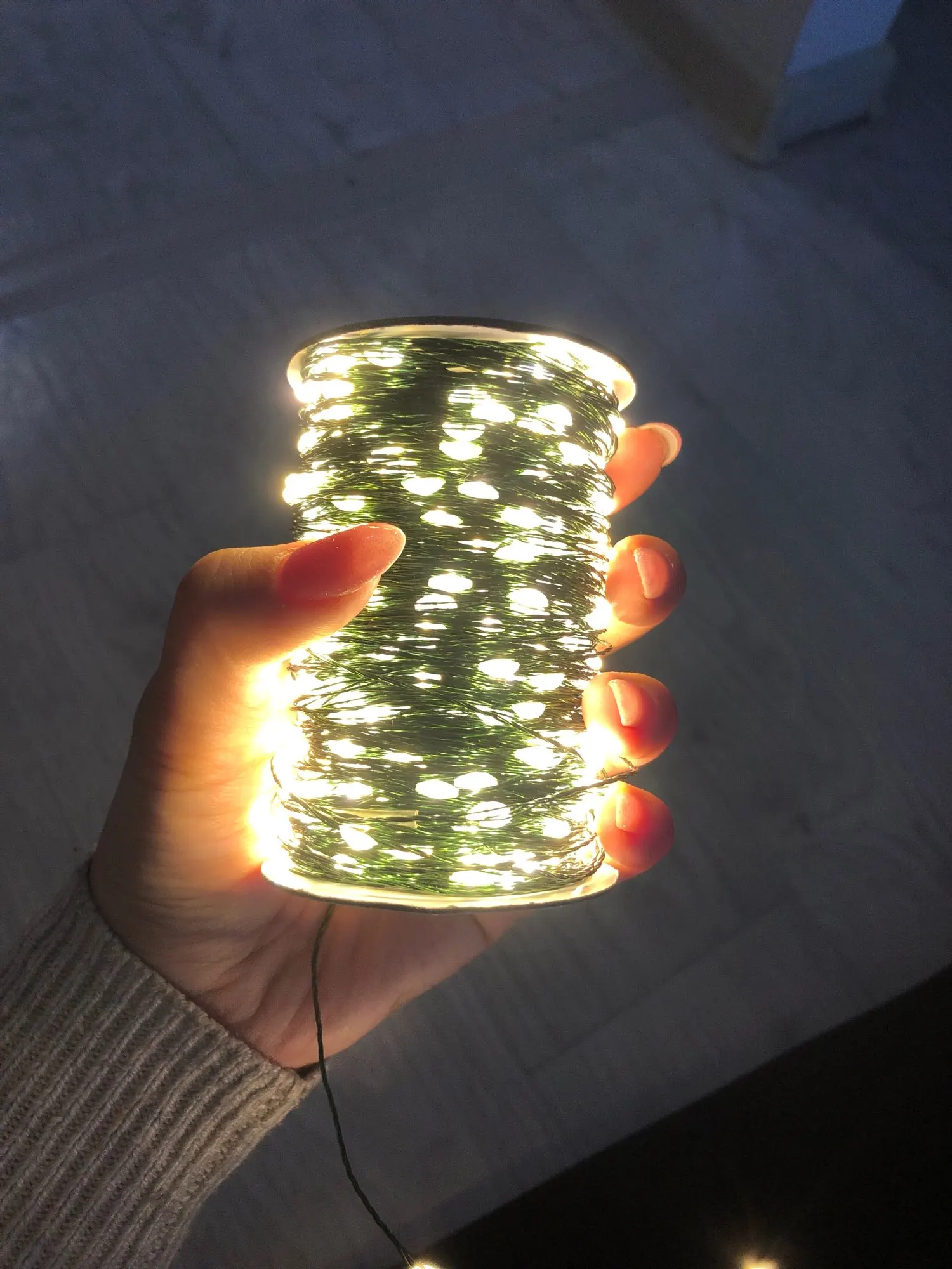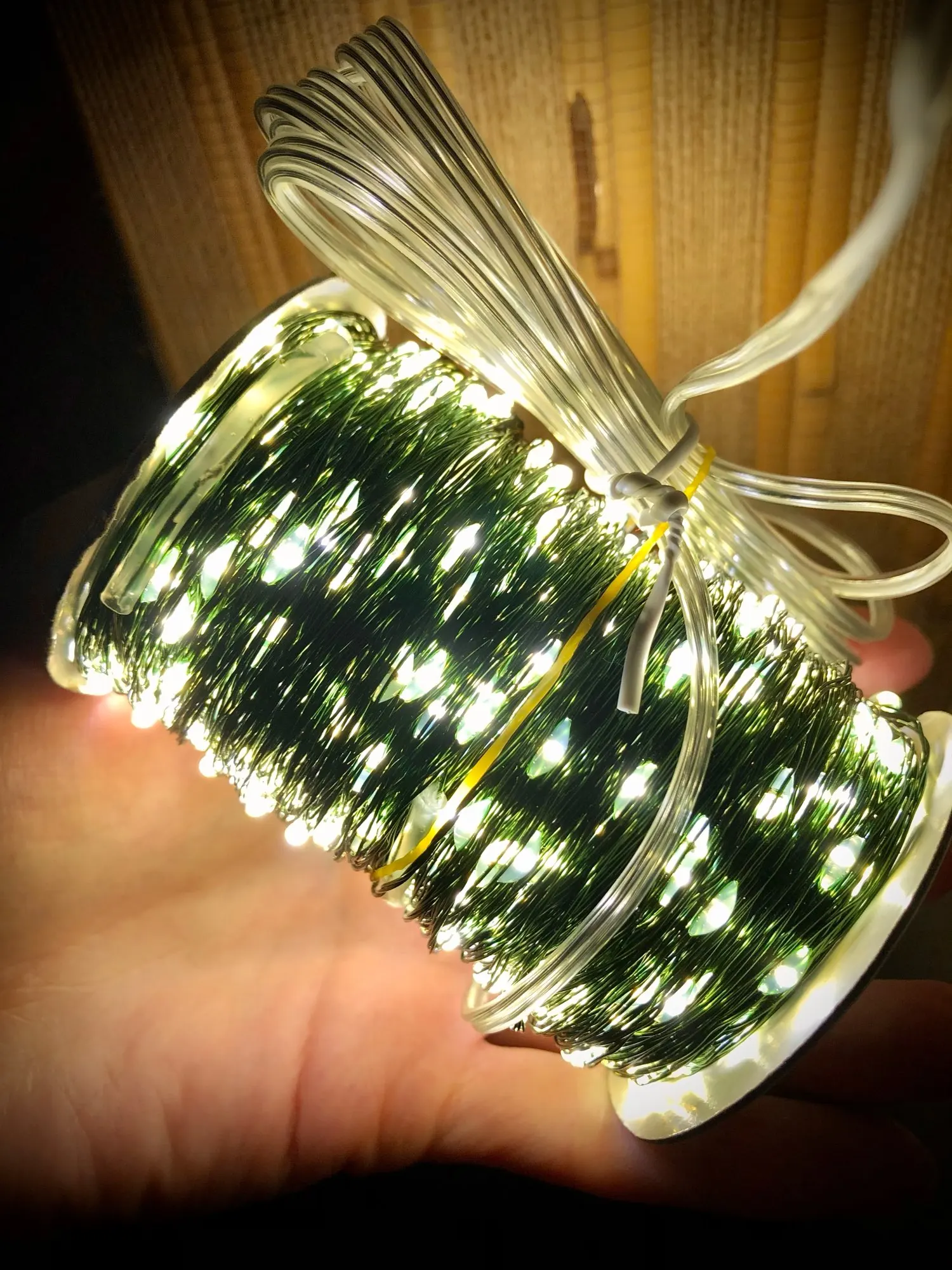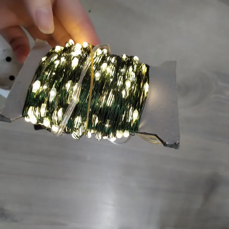 Заказывала 50м прибыло как на фото в небольшой катушке, чтобы вы понимали я обвивала каждую ветку этой гирляндой до вверху, высота елки 2м как раз хватило до макушки. Прибыла в идеальном состоянии в пупырке.