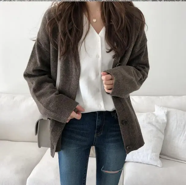 Женский вязаный кардиган с V-образным вырезом, свободного покроя