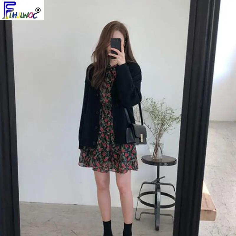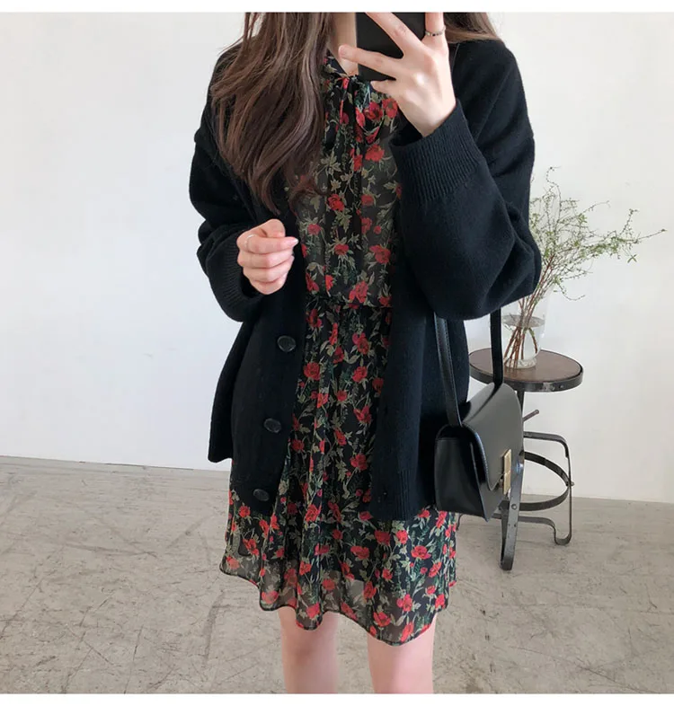 Зимний винтажный кардиган, пальто, женское модное Повседневное трикотажное пальто на пуговицах с длинным рукавом, пальто с V-образным вырезом, черный, серый, 10719