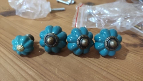 Really happy with these, the screws are a little short for what I need but easy to get longer ones from hardware store. Ceramic handles themselves are lovely green and great quality.