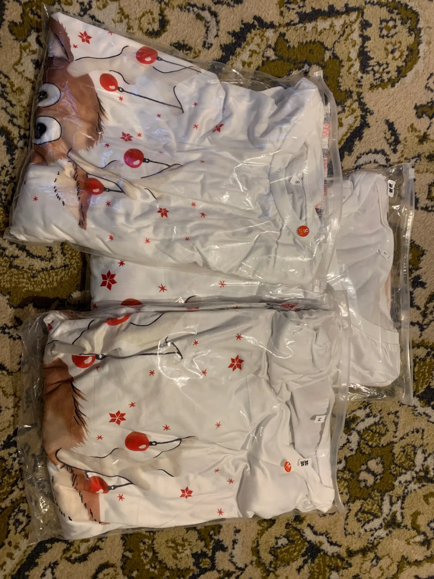 женская пижама:на рост 167, 42 размер - взяла М - мне идеально, достаточно свободно, особенно футболка, но мне нравится, брюки вообще отлично. А вот мужу велико. На рост 178, в России носит М чаще, редко S- заказали L - и штаны, и футболка прям большие. Ребенку 4 месяца на момент Нового года, но я взяла 2 размер-специально, так что можно сказать, что подошло. Ну и действительно, стоит отметить, что посылка пришла достаточно быстро. Примерно месяц до Челябинска, заказ делала в период распродаж.
