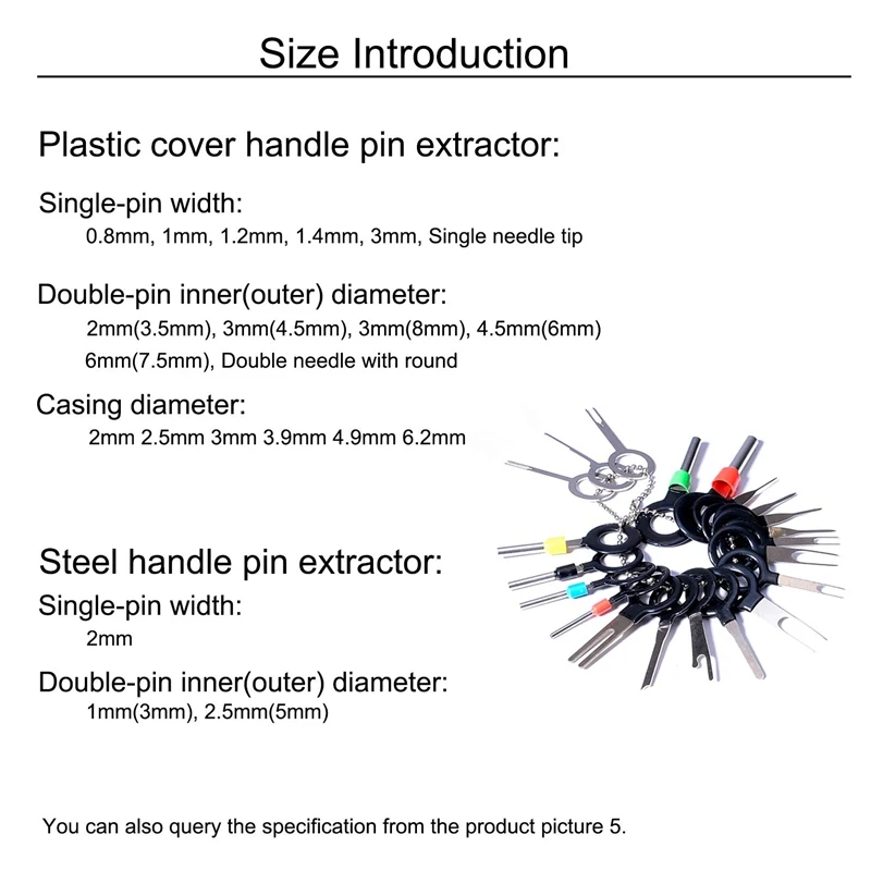 Материал: изготовлен из стали и пластика. Гибкий, упругий и прочный.Функция: они могут без усилий извлечь клеммные провода из разъема жгута проводов и добавить новый провод, который не причинит никаких повреждений.Совместимость: набор инструментов представляет собой универсальные инструменты, подходящие для большинства коннекторов, которые используется для большинства автомобилей, мотоциклов и других электронных устройств (например, бытовой техники).Использование: нет необходимости открывать клеммы, просто нажмите и потяните за клеммные штифты. Это обеспечивает дополнительный рычаг, который вы можете легко вынуть провод. Компактная форма позволила легко использовать и переносить их.Набор инструментов предназначен для извлечения электронных устройств без повреждения устройств.Не нужно призовать клеммы, просто нажмите и потяните штифты клемм с набором инструментов.Совместим с:Набор инструментов-это универсальные инструменты, подходящие для большинства коннекторов, которые используется для большинства автомобилей, мотоциклов и других электронных устройств (например, бытовой техники).Спецификация:Экстрактор штифтов ручки пластиковой крышки:Ширина одного штифта: 0,8 мм, 1 мм, 1,2 мм, 1,4 мм, 3 мм, наконечник одной иглы.Двухконтактный внутренний (внешний) Диаметр: 2 мм (3,5 мм), 3 мм (4,5 мм), 3 мм (8 мм), 4,5 мм (6 мм), 6 мм (7,5 мм), двойная игла с круглой.Диаметр корпуса: 2 мм 2,5 мм 3 мм 3,9 мм 4,9 мм 6,2 мм;Экстрактор со стальной рукояткой:Ширина одноштифта: 2 мм.Двухконтактный внутренний (внешний) Диаметр: 1 мм (3 мм), 2,5 мм (5 мм).Вы также можете запросить спецификацию на изображении товараЦвет: серебристый + черныйПосылка7 шт. одноконтактный экстрактор8 шт. двухконтактный экстрактор6 шт. обсадных инструментовПримечание: Острые детали, храните в недоступном для детей месте.Только вышеуказанное содержимое упаковки, другие товары не включены.Примечание светильник вая съемка и различные дисплеи могут привести к тому, что цвет товара на изображении немного отличается от реального. Допустимая погрешность измерения составляет +/- 1-3 см.